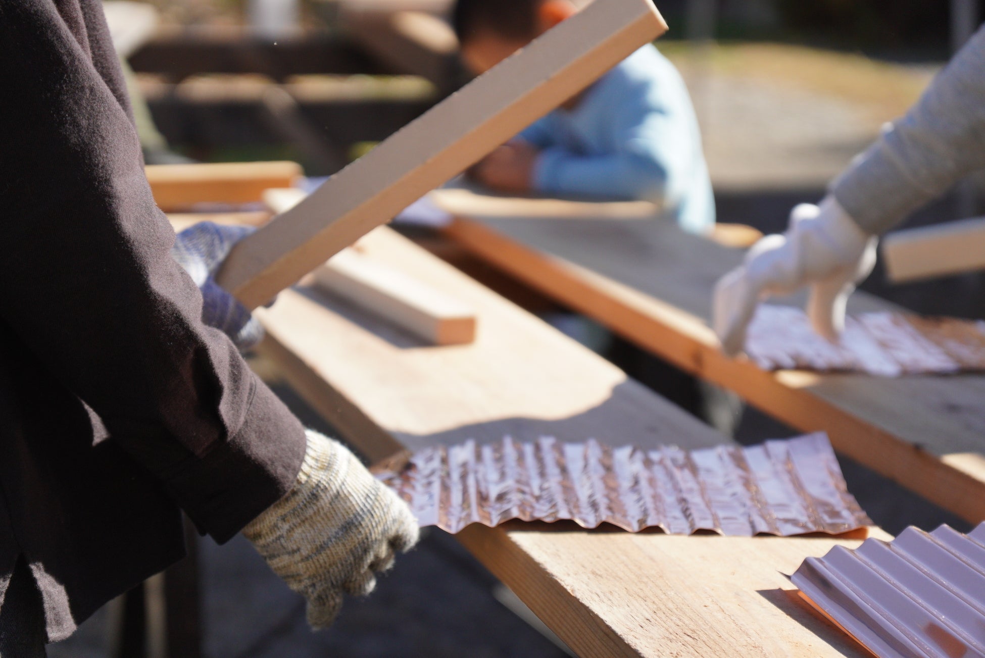 屋根に貼る手曲げの銅板や外壁の焼杉は、クラウドファンディングのリターンとしてワークショップを行い、のべ150人の協力を得て作りあげました。
