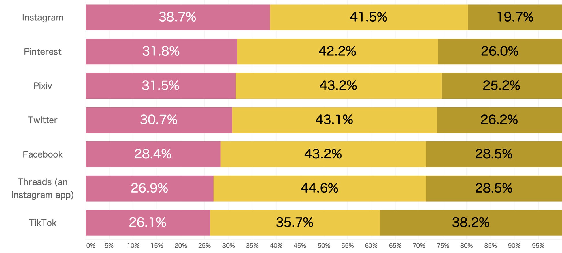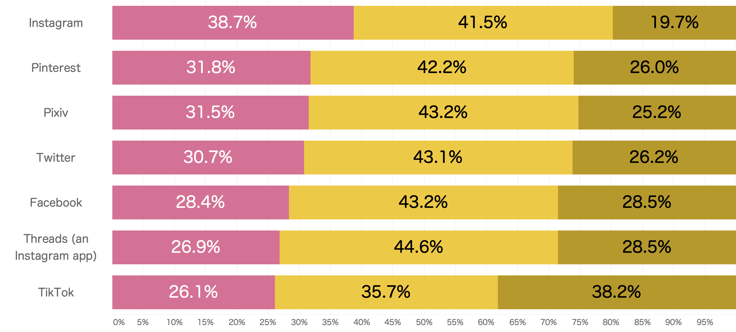 SNSメディアのカテゴリに分類し、個別メディアごと(「Instagram」「Pinterest」「Pixiv」「Twitter」「Facebook」「Threads (an Instagram app)」「TikTok」)に、信頼出来るか否かを質問しました。