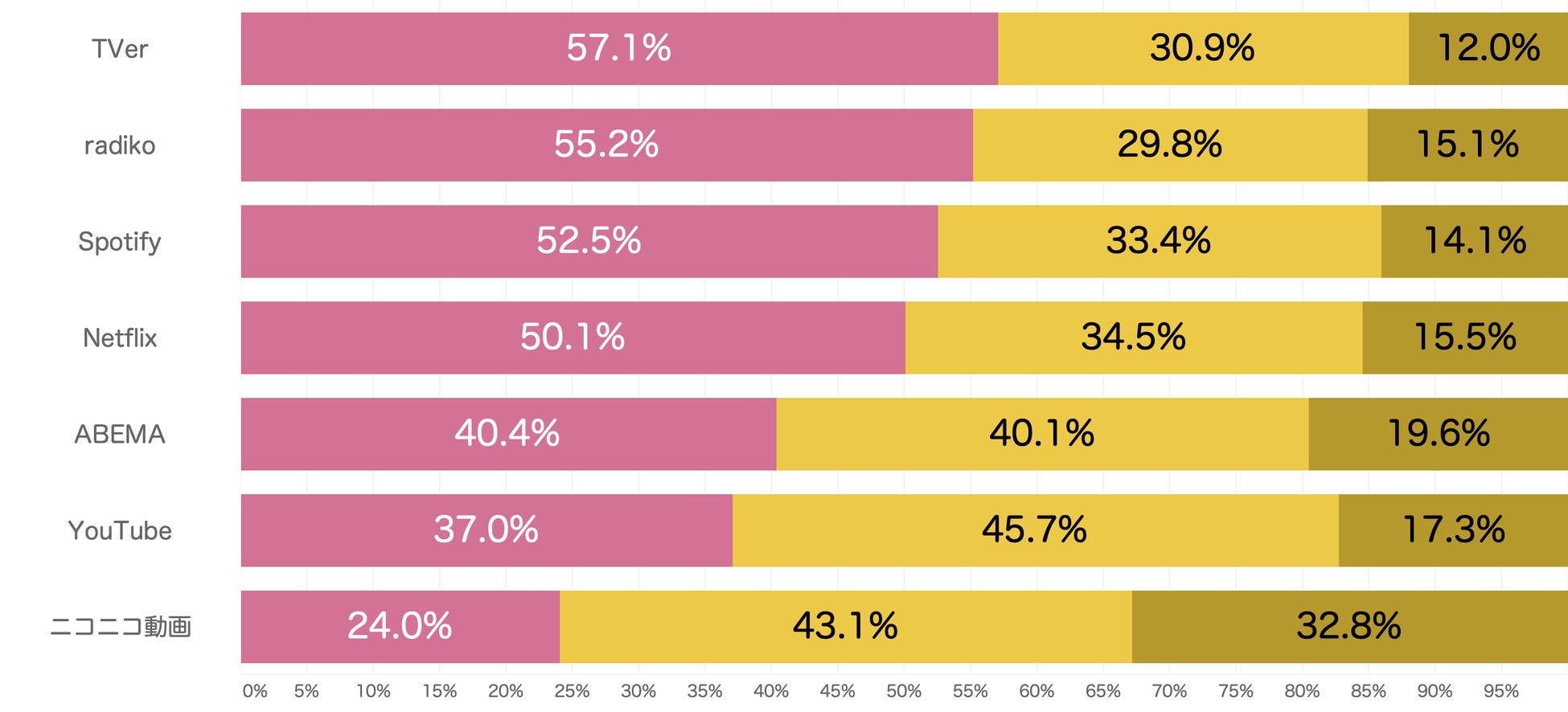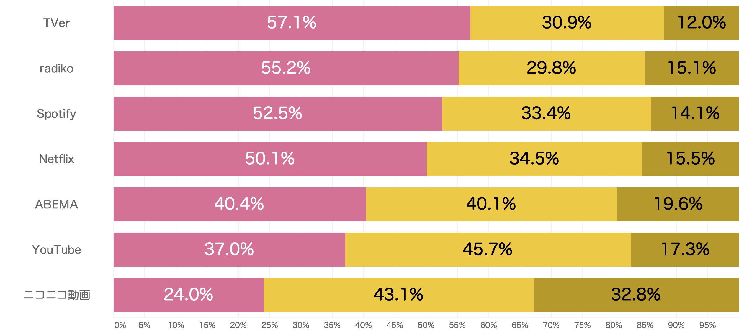 動画・音楽メディアのカテゴリに分類し、個別メディアごと(「TVer」「radiko」「Spotify」「Netflix」「ABEMA」「YouTube」「ニコニコ動画」)に、信頼出来るか否かを質問しました。