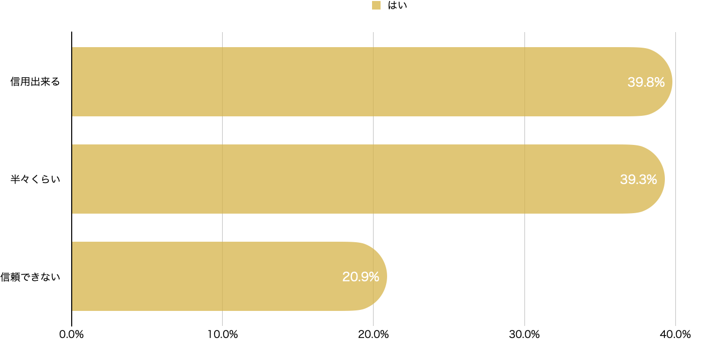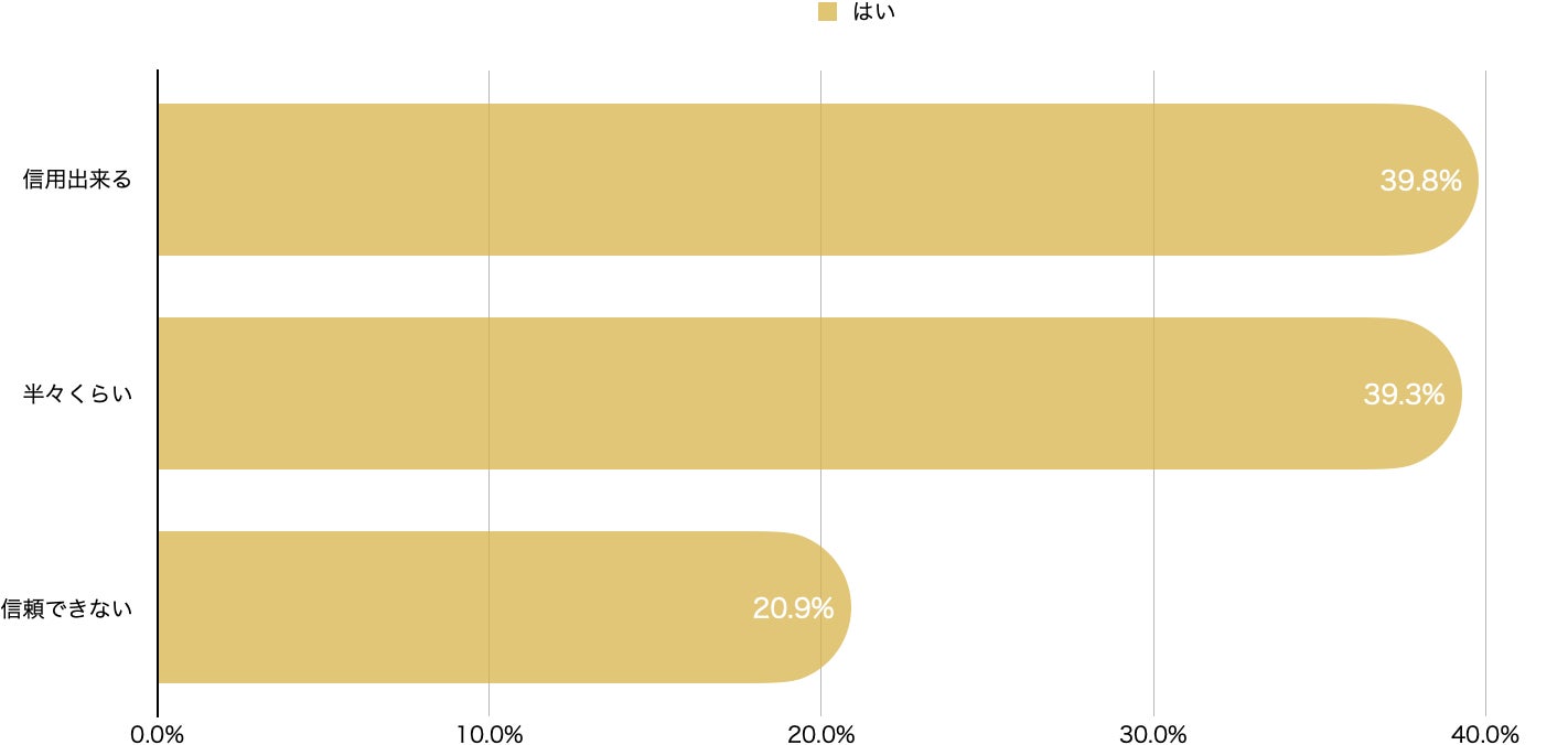 グラフは、『信頼できる』(「非常に信頼できる」「ある程度信頼できる」)、『半々くらい』、『信頼出来ない』(「あまり信頼できない」「全く信用できない」)の3分類で構成しております。