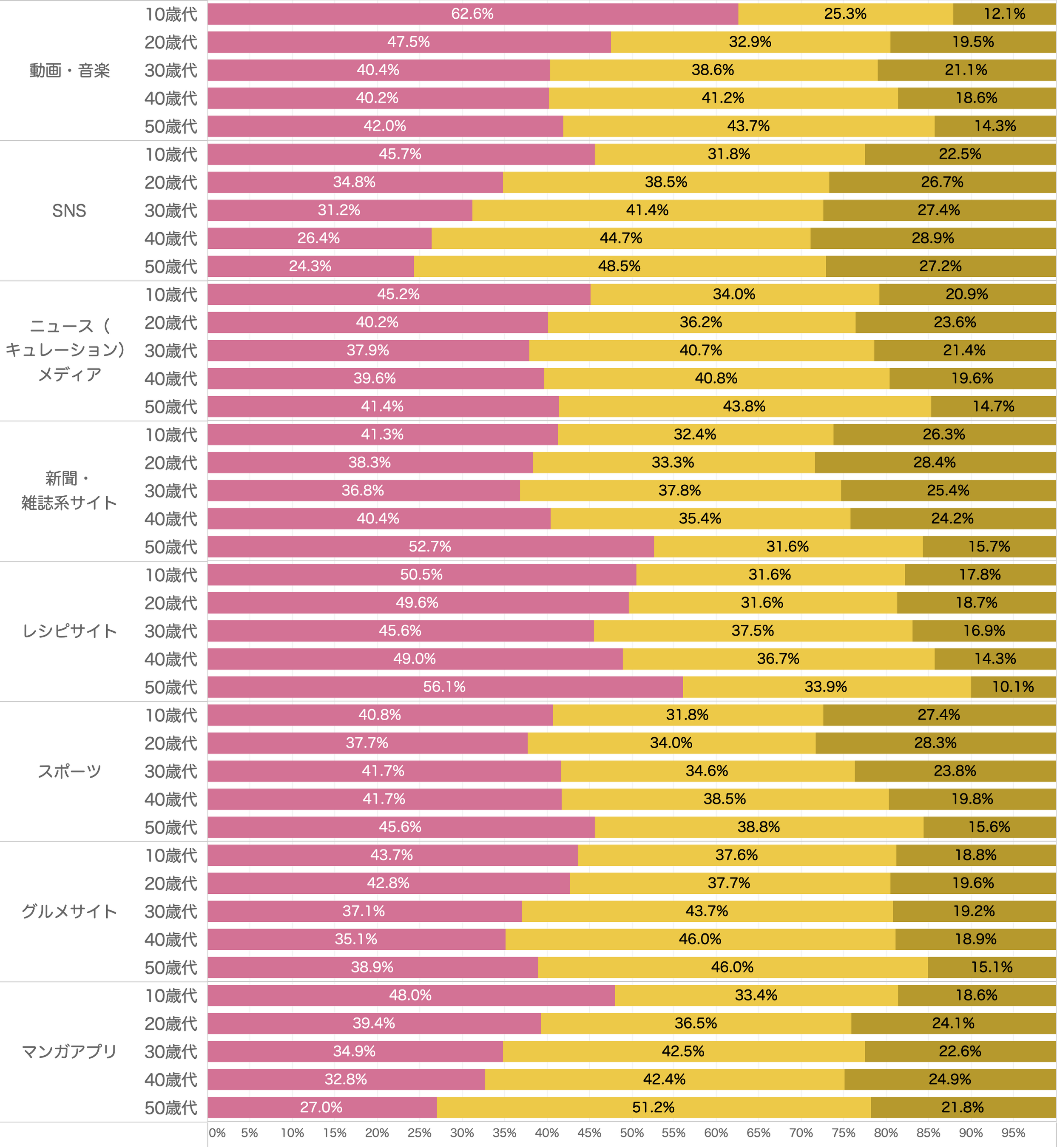 「動画・音楽メディア」「SNS」「ニュース(キュレーション)」「新聞・雑誌系」「レシピサイト」「スポーツ」「グルメサイト」「漫画アプリ」