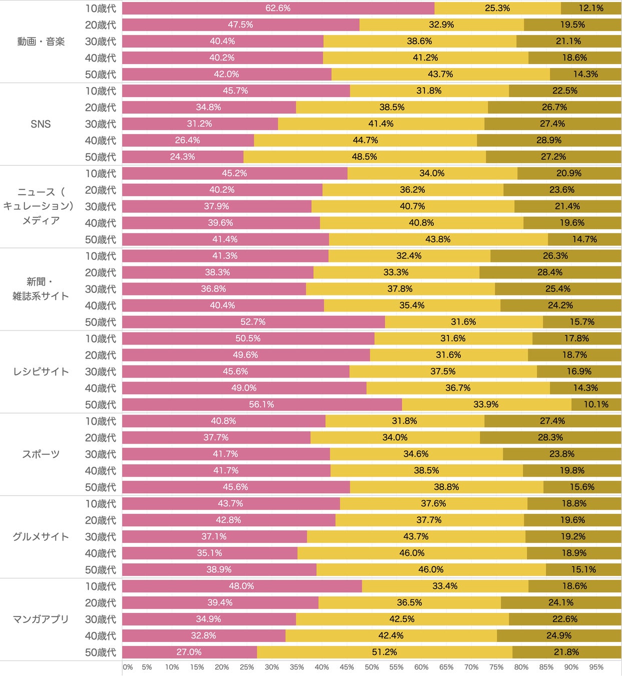 本調査によって、各カテゴリにおいて世代間の違いが比較的明確に出ているのが「動画・音楽」「SNS」「新聞・雑誌系サイト」および「漫画アプリ」という結果となりました。