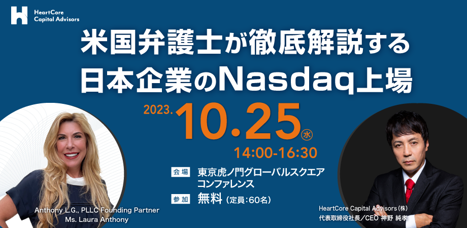 日本企業のNasdaq上場を支援するコンサルティング会社、HeartCore Capital Advisors株式会社(本社:東京都千代田区、代表取締役社長:神野 純孝、以下 HCA社)は、米国弁護士Ms. Laura Anthonyの来日に合わせ、Nasdaq上場を目指す日本企業向けセミナー「米国弁護士が徹底解説する日本企業のNasdaq上場」を2023年10月25日(水)14:00-16:30、東京虎ノ門グローバルスクエアコンファレンスに於いて参加無料で開催いたします。