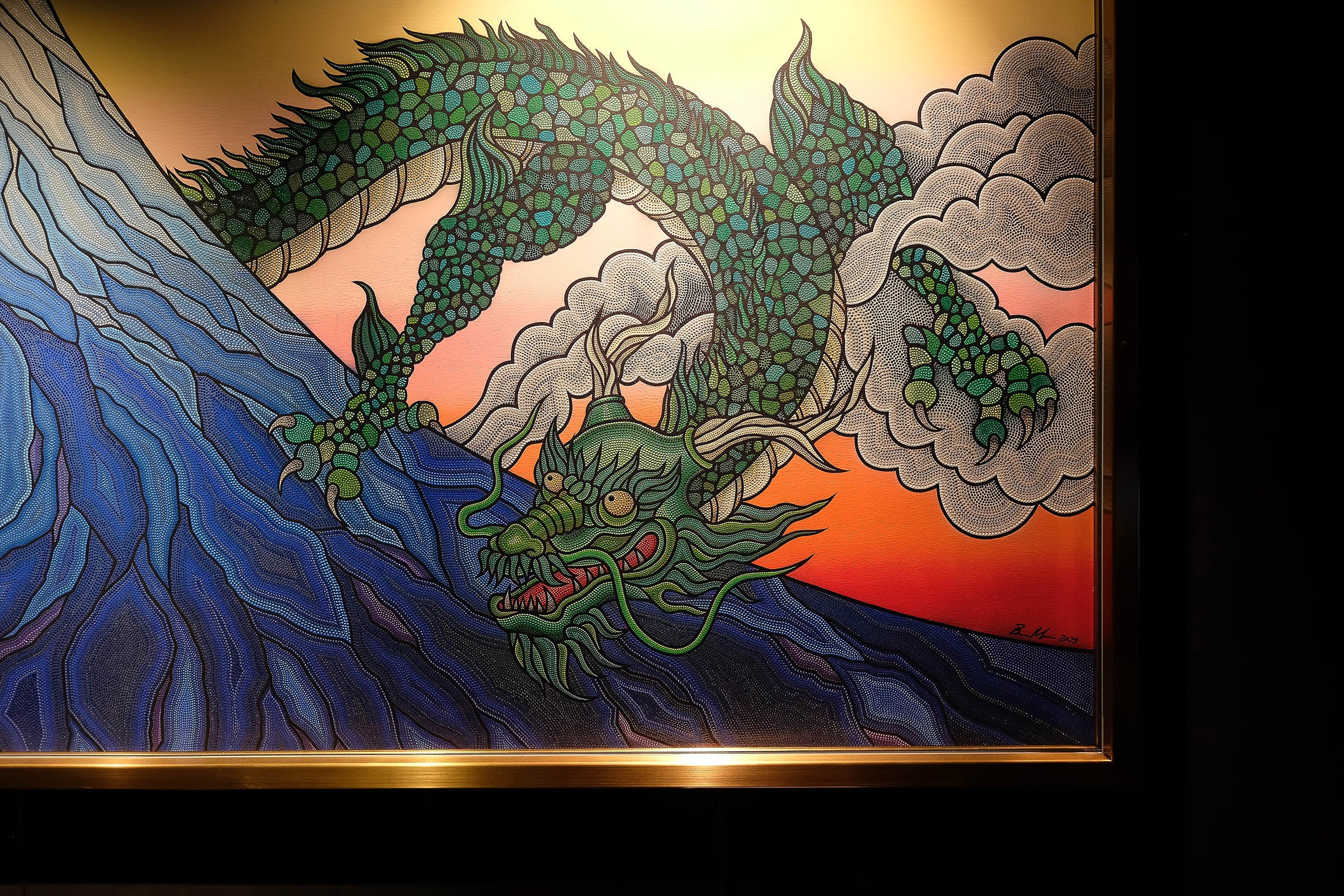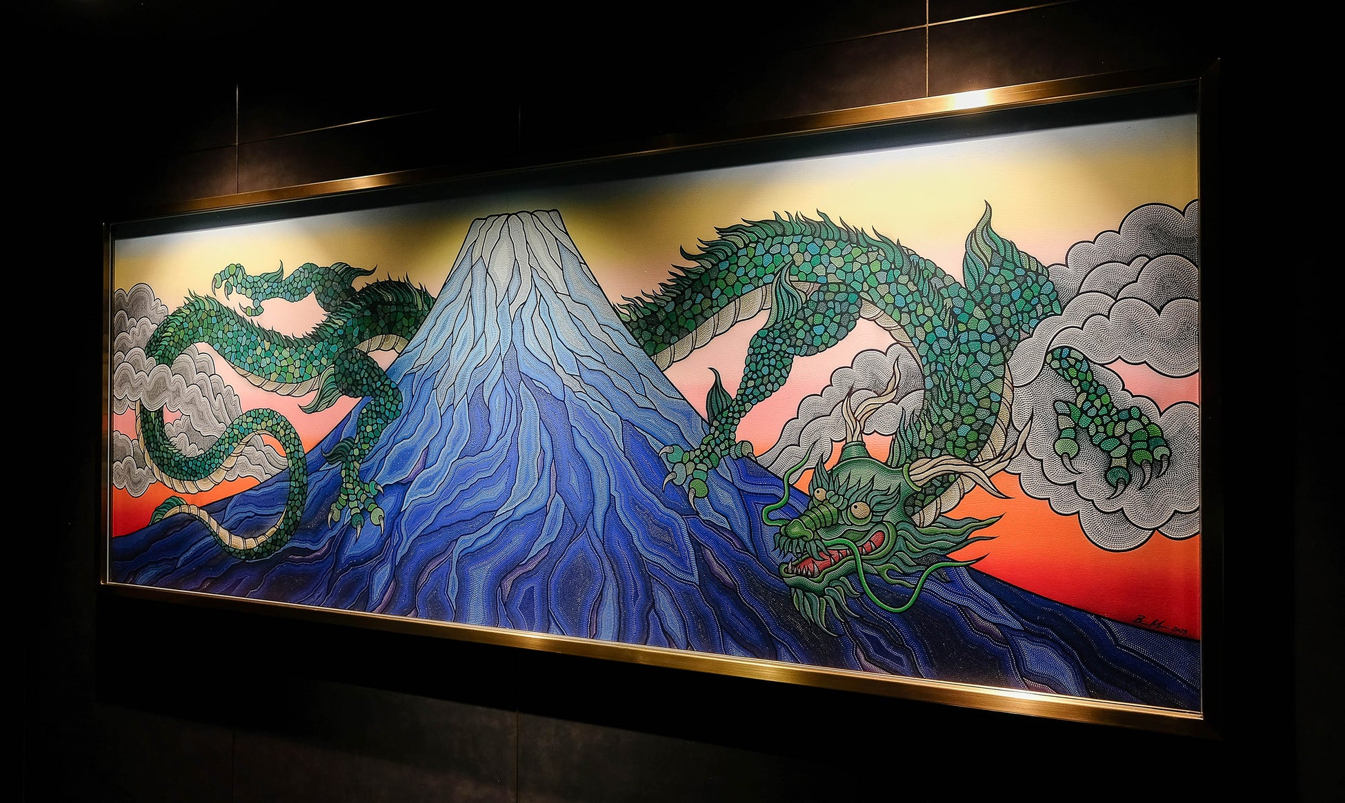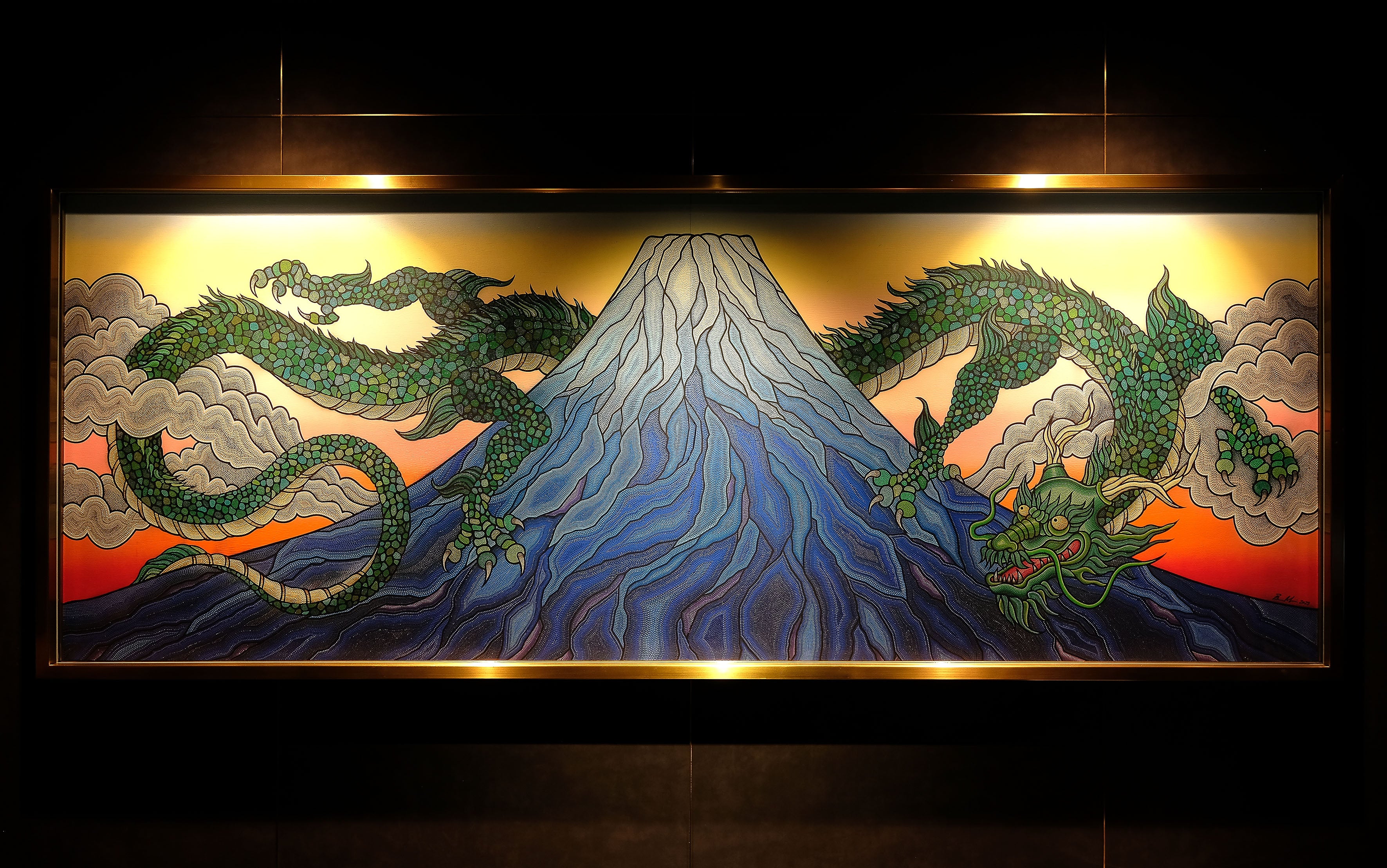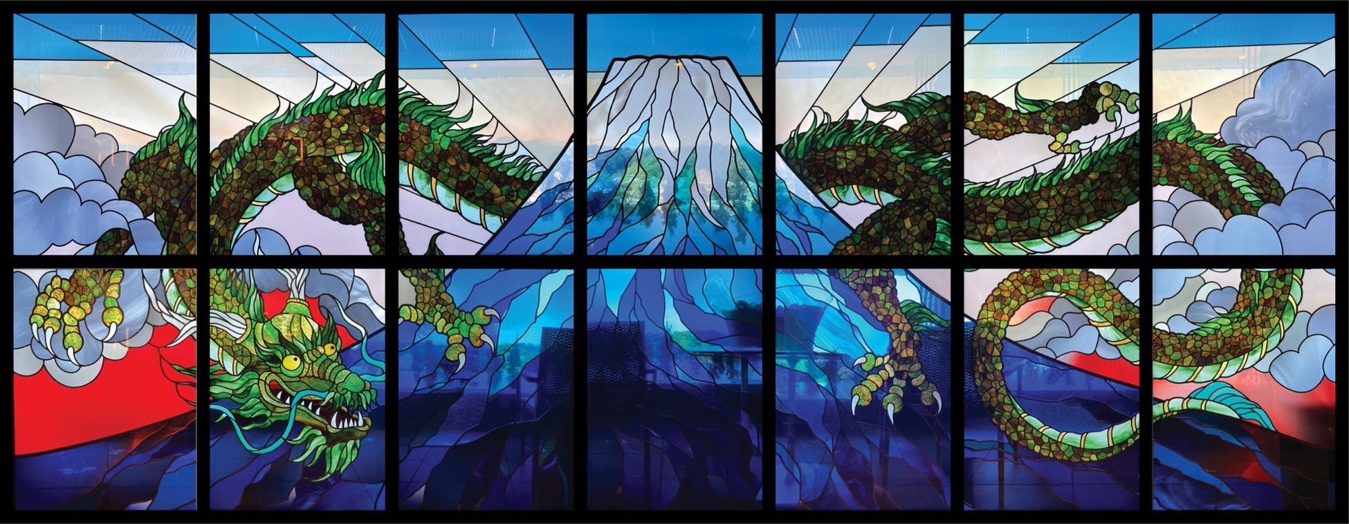 『龍』:顔は凹凸感のあるガラスを、鱗は濃淡のあるガラス選んではめ込むことで荘厳さを追求。富士の山頂から裾野にかけてのグラデーションは透過率を意識した構成になっています。