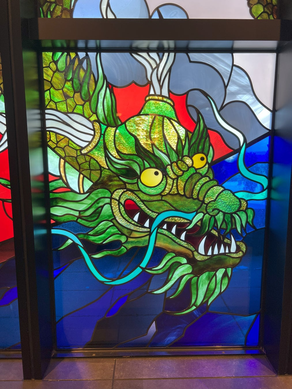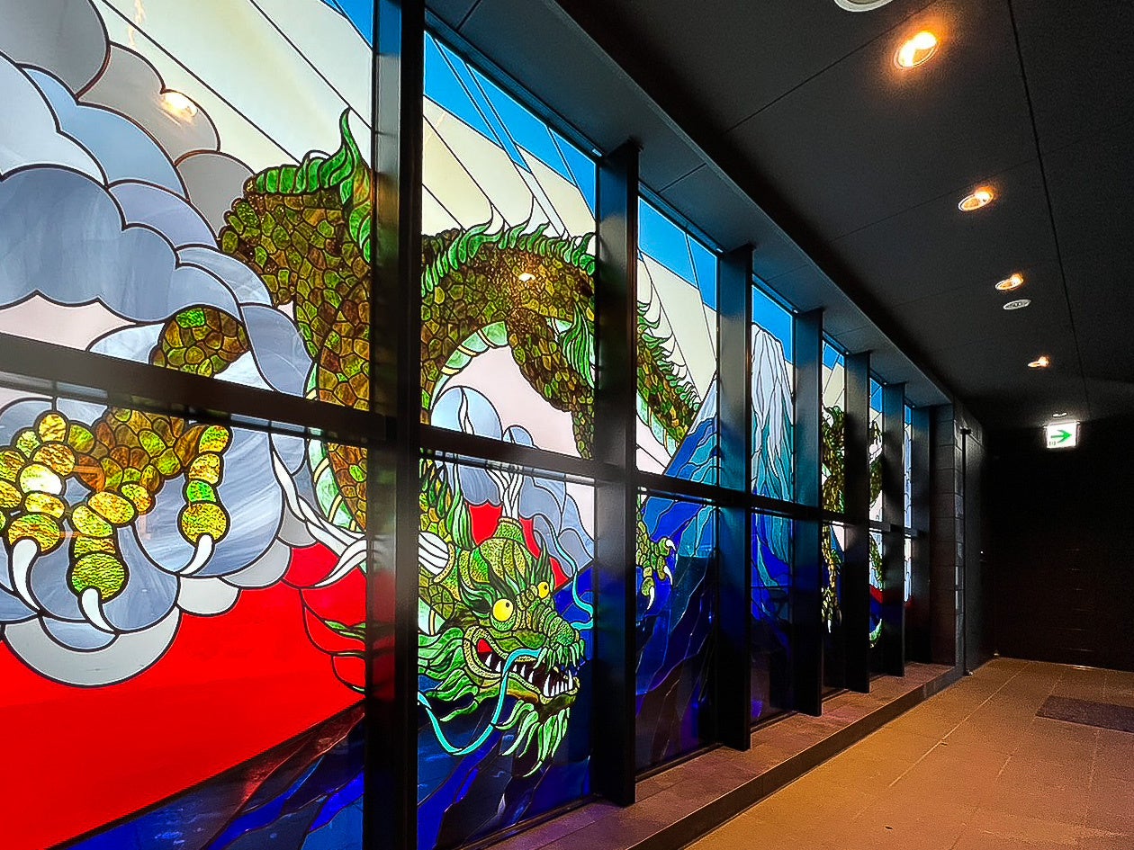 【龍・ステンドグラス(男性スパ施設内)】横約6.0メートル、縦約2.2メートル