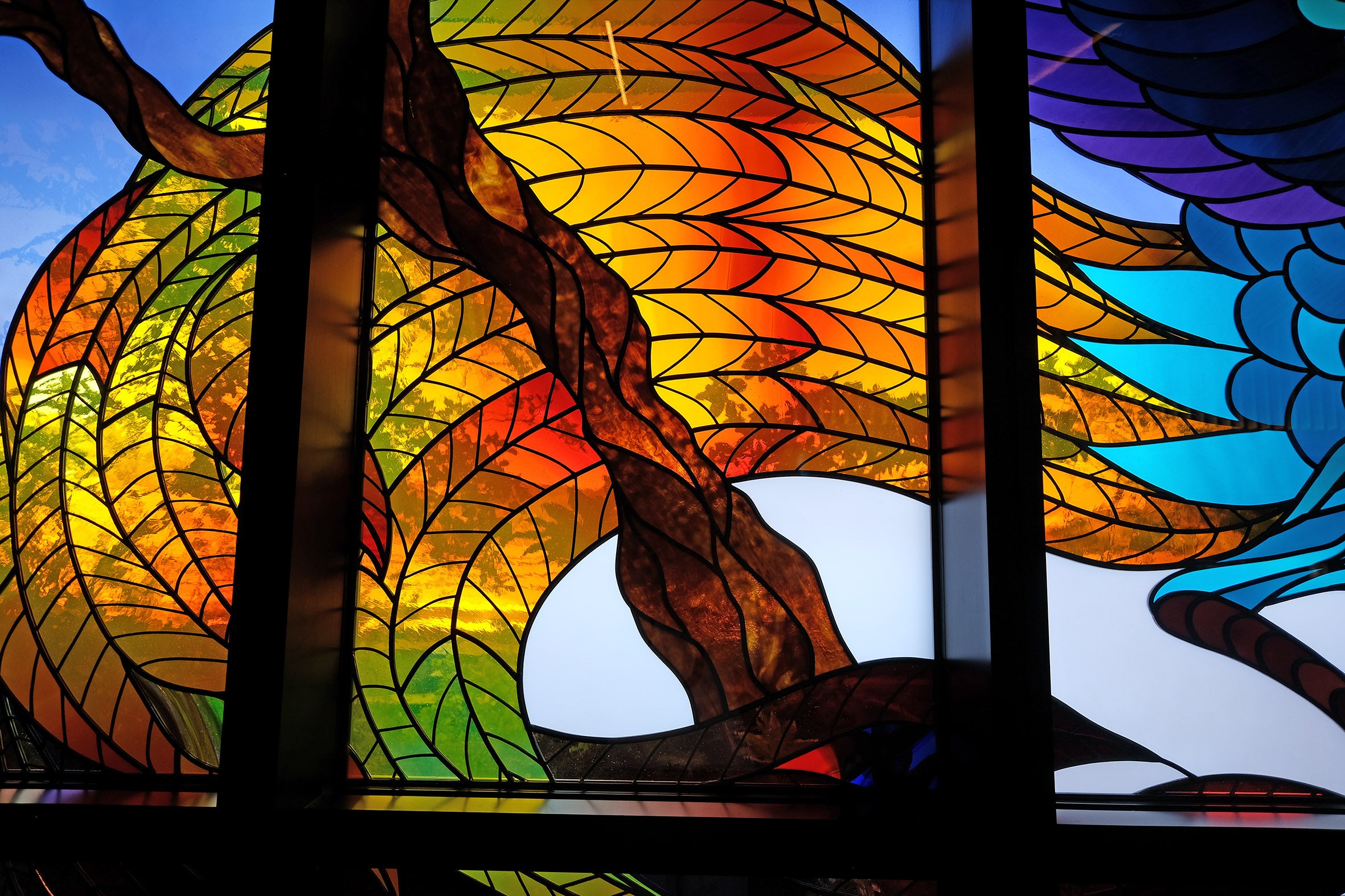 『鳳凰』:顔は、世界随一のドイツ・ランベルツ社製のアンティークガラスを惜しみなく使用し、赤と青を有機的に表現。尾羽は、黄と橙、赤と紫の濃淡のあるガラスで構成することで、鮮やかさと気品を表しています。