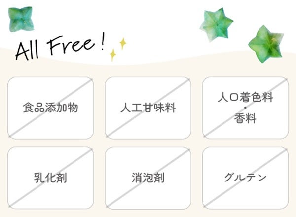 ●【無添加】食品添加物、人工甘味料・着色料・香料、乳化剤、グルテン、すべて含まれません。