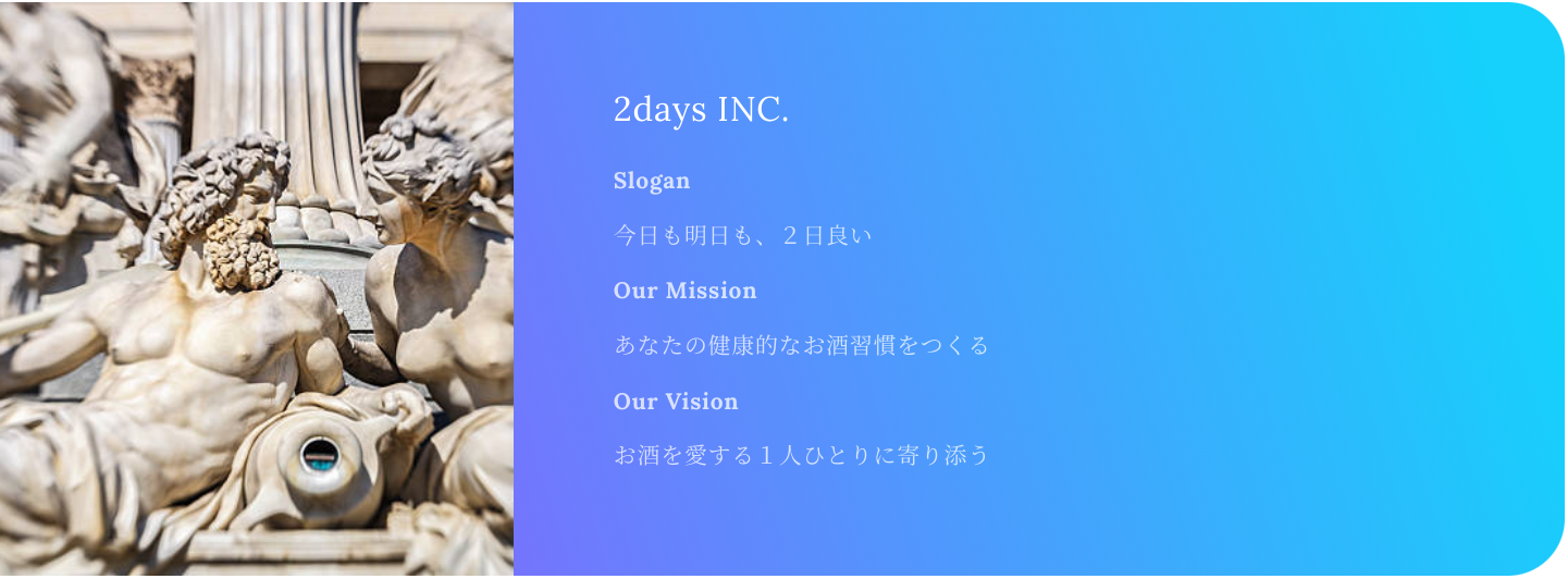 株式会社2daysはお酒を愛する1人ひとりに寄り添い、あなたの健康的なお酒習慣をつくる会社です。