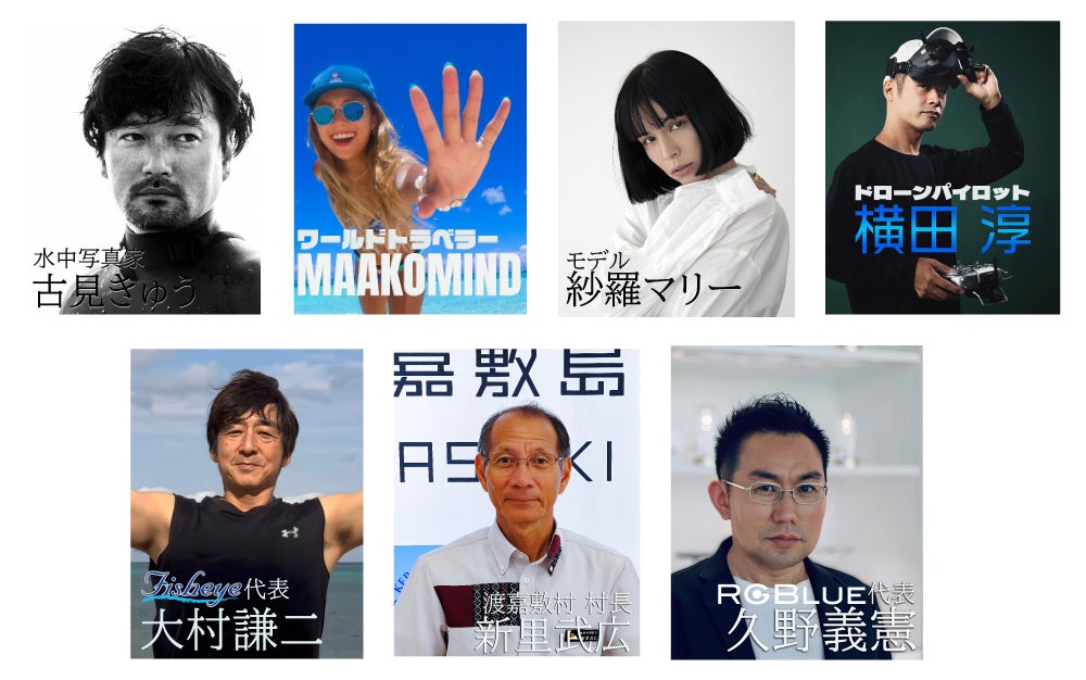 水中写真家の古見きゅう氏、ワールドトラベラーのMAAKOMIND氏、モデルの紗羅マリー氏、ドローンパイロットの横田淳氏、Fisheye代表の大村謙二氏、RGBlue代表の久野義憲氏、渡嘉敷村村長の新里武広氏、合計7名。