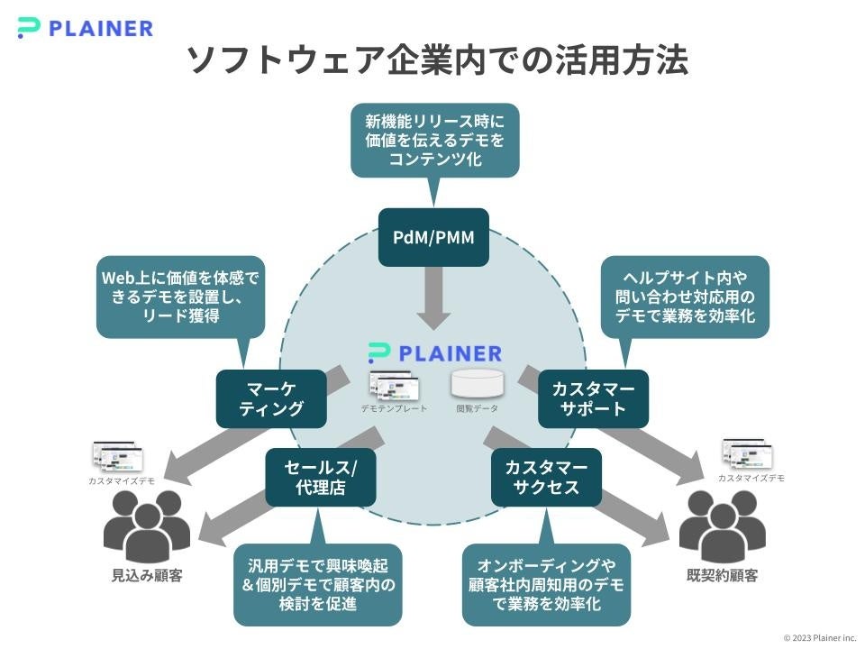 PLAINERは、SaaS企業のPMM(プロダクトマーケティングマネージャー)を中心にマーケティング、セールス、カスタマーサクセス等のビジネス部門で導入が進んでおり、例えば、サービスサイト上に製品のデモ体験を設置することで顧客に製品理解を促し、CVRが最大2倍以上となるなど、重要KPIの向上に貢献しています。