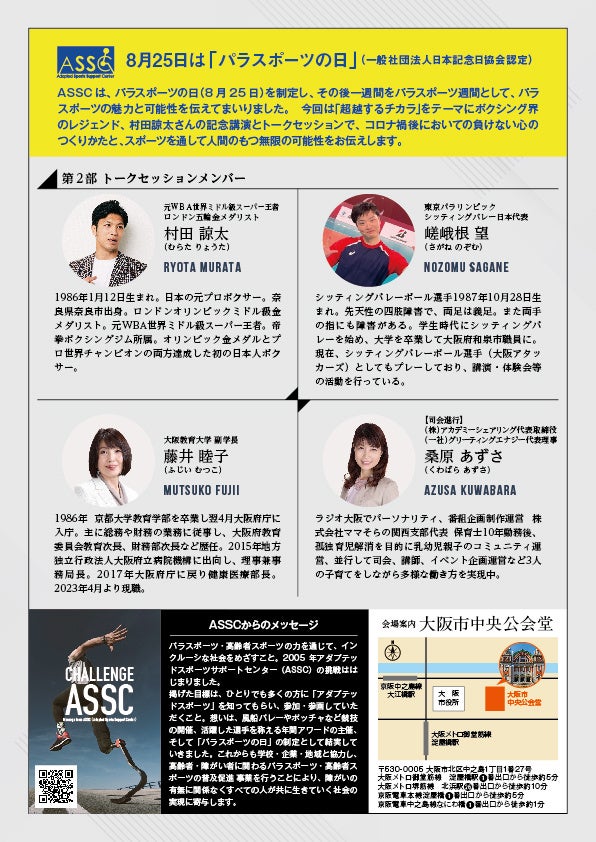 特定非営利法人アダプテッドスポーツサポートセンター(ASSC)は、パラスポーツの日(8月25日)を制定し、その後一週間を「パラスポーツ週間」として、パラスポーツの魅力と可能性を伝える活動を展開してきました。