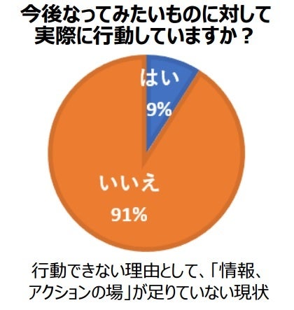 しかし、50代前後の女性3,090名へのアンケート調査(株式会社KADOKAWA調べ)によると、「今後なってみたいものに対して実際に行動していますか?」という質問に対し9割以上が「行動していない」と回答しています。