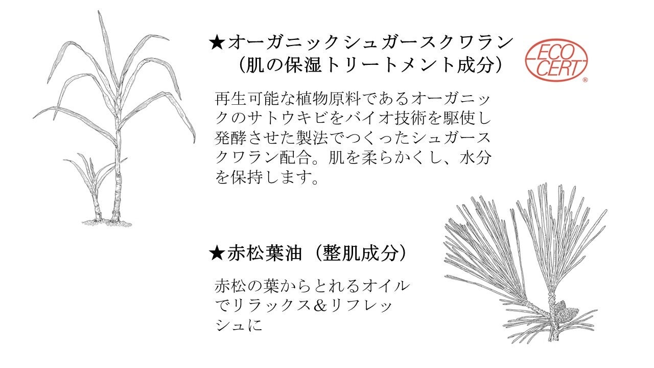 1, サトウキビを圧搾・発酵させて作り、保湿力と保水力に優れた植物由来のスクワラン、オーガニックシュガースクワラン(整肌成分)配合。
