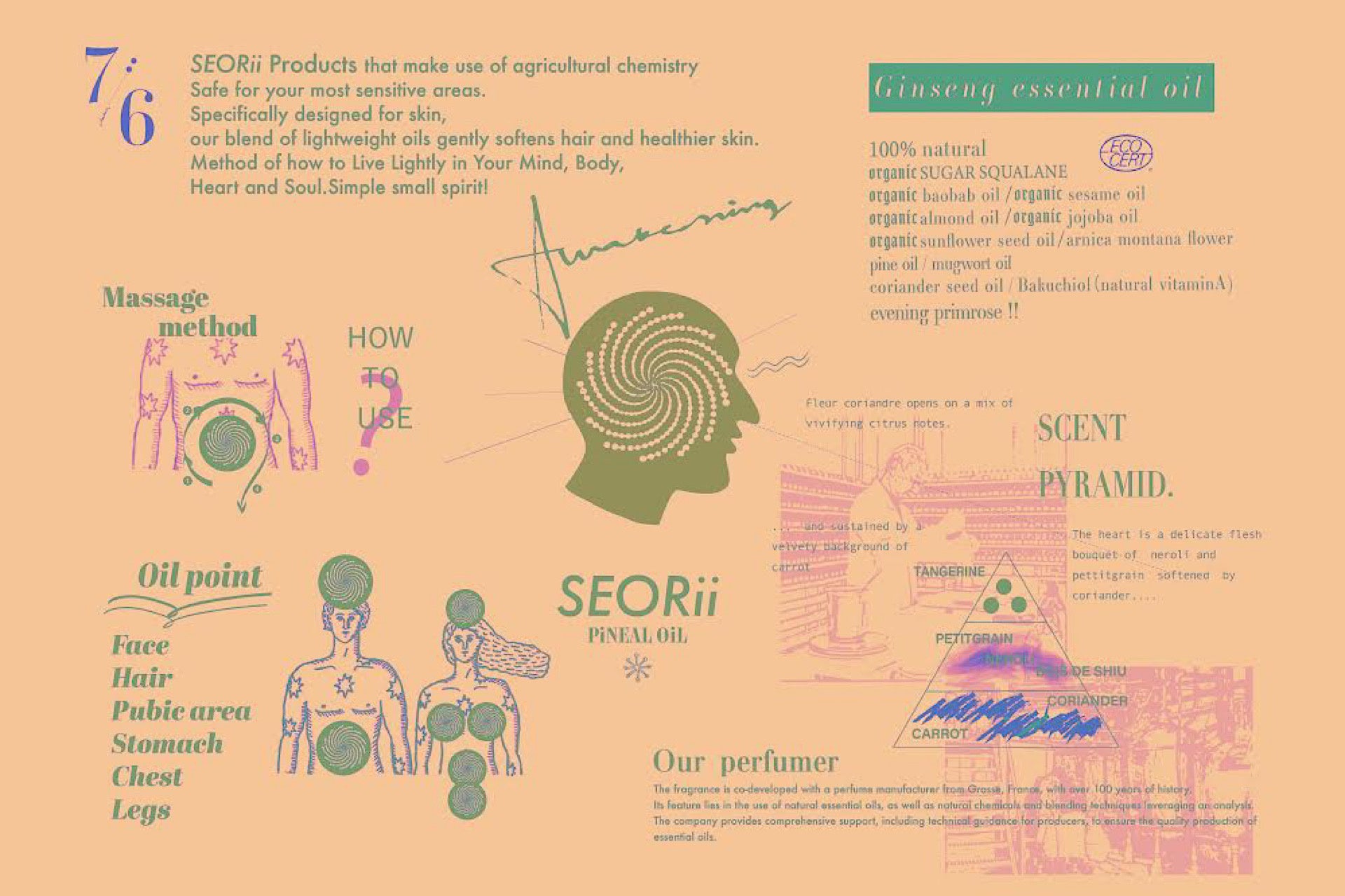 今回はプロジェクトの第2弾として、マインドケア、フェムケアに着目し、18種類の植物美容成分をブレンドした全身に使えるマルチボディオイル「SEORii PiNEAL OiL ピニアルオイル」(価格:3960円(税抜)、容量:60ml、スポイト付きは価格:4290円(税込))をセレクトショップ型店舗EQUALAND(イコーランド/ 東京都渋谷区ミヤシタパーク内)および公式サイトで、2023年8月29日に発売いたします。