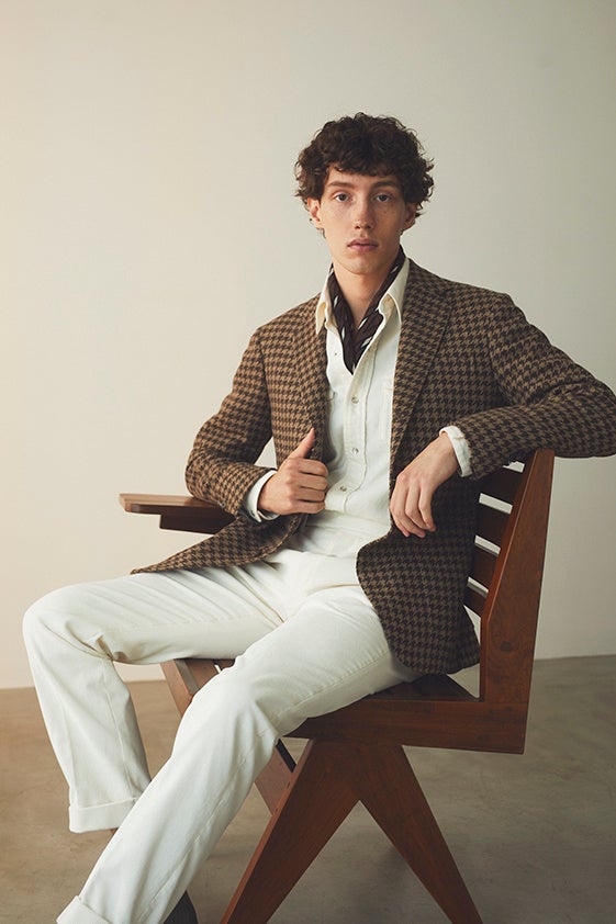 ブラウン系のジャケットを軽快に見せるようシャツとパンツをオフホワイトで構成しています。