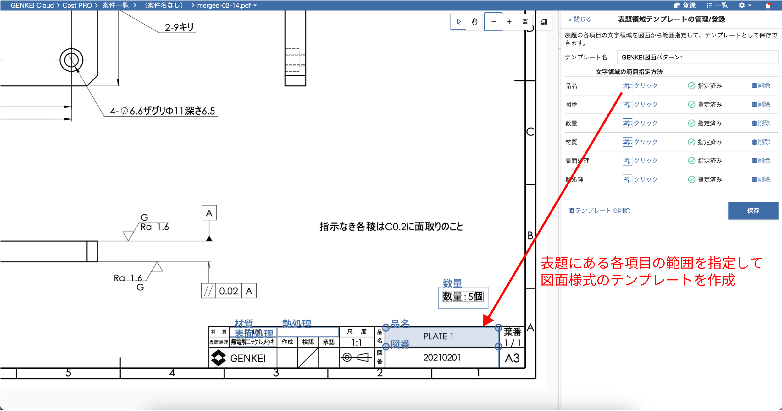 今回のアップデートでは、図面上で品名や図番、表面処理等を記載する表題の情報を、エリアを認識できる高度なOCR機能を用いて、自動的に読み取り登録できる「表題一括登録」機能を追加いたしました。多い時には数十枚の図面からなる案件の管理において、手間のかかる表題情報の入力をより効率的に行いたい、という要望にお応えする機能です。