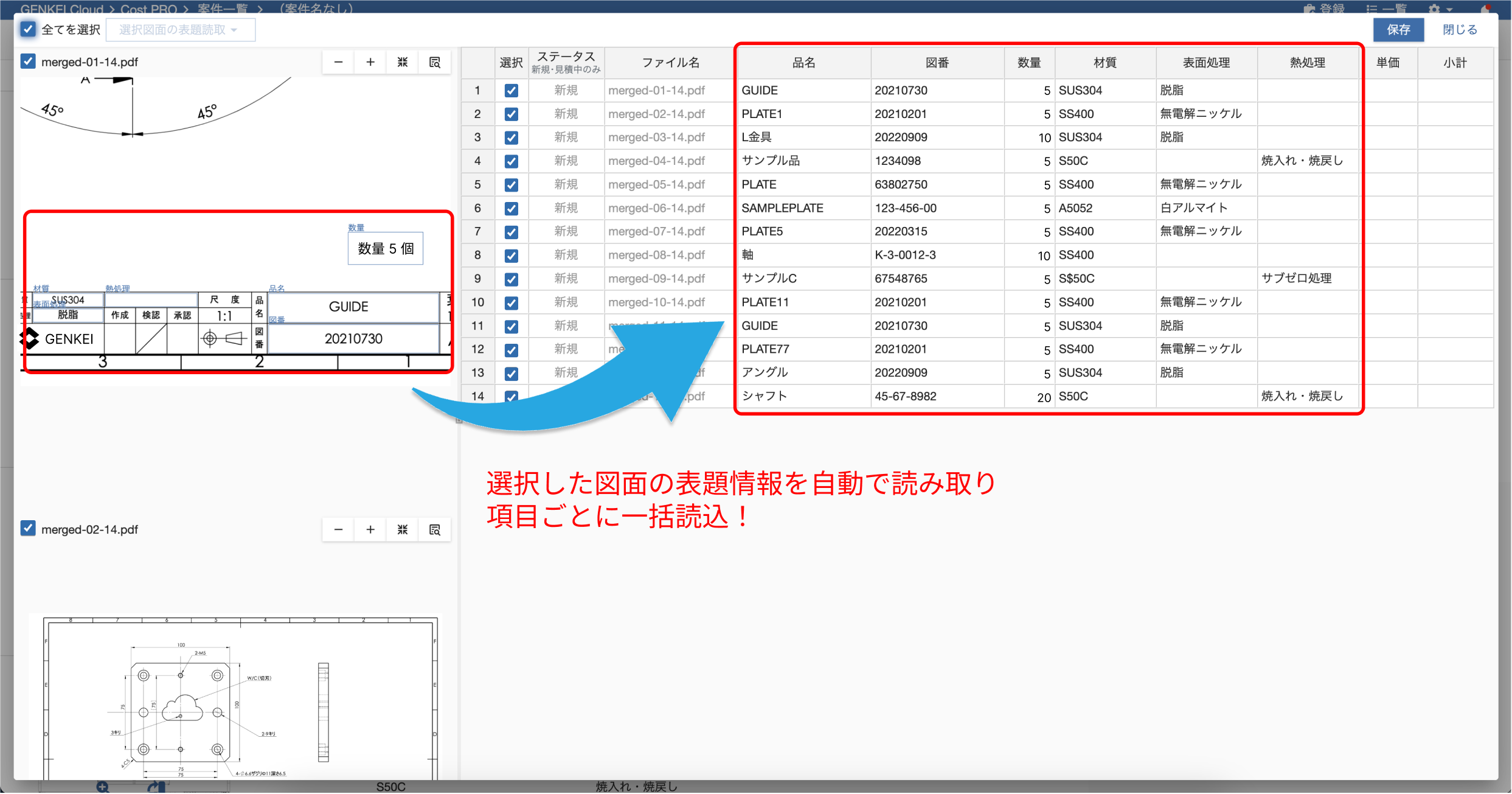 読み込んだ情報は下図のように自動で一覧化され、保存ボタンを押すだけで複数の図面の表題情報が登録されます。