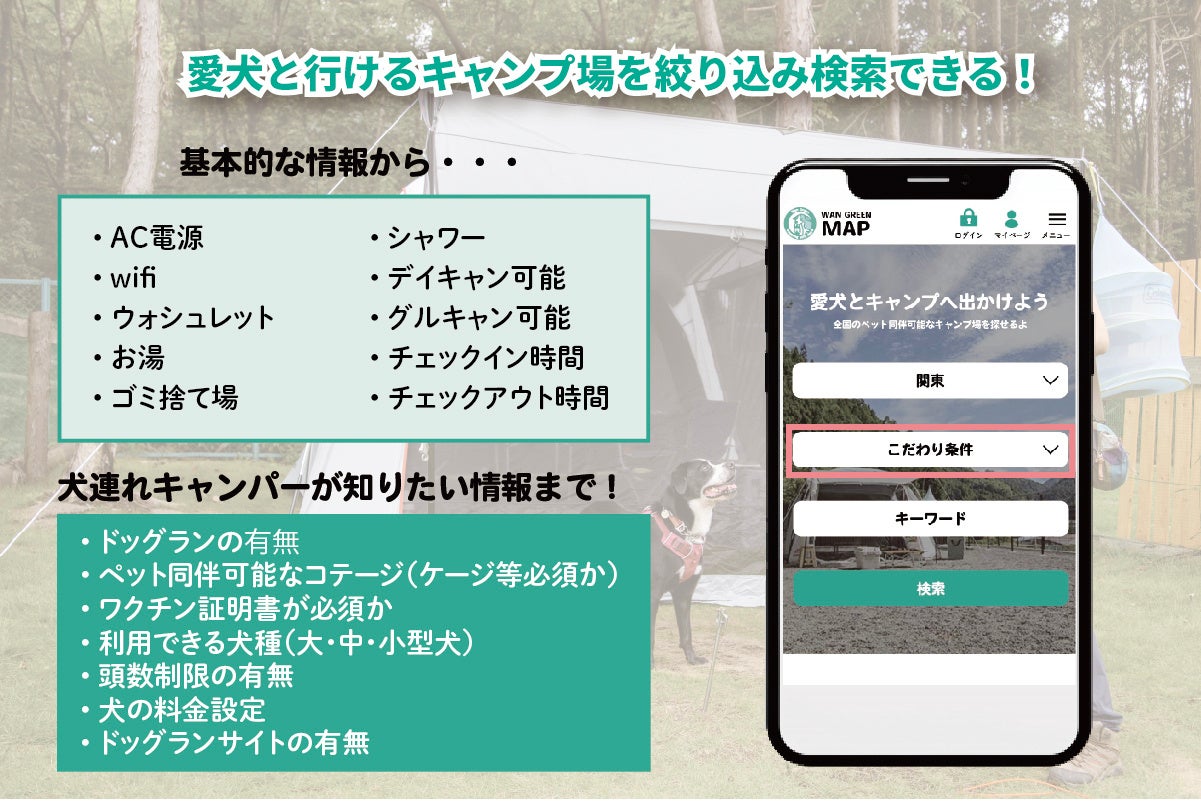 「わんグリーンマップ」では全国のペット同伴可能なキャンプ場を検索できます。既存のキャンプ場検索サービスでは、ペット同伴可能かどうかの確認はできても、犬連れキャンパーが知りたい情報があまり載っていません。そのためYoutubeや各種SNS、公式サイトや個人ブログなどあらゆるサイトを回遊して情報収集する必要がありました。