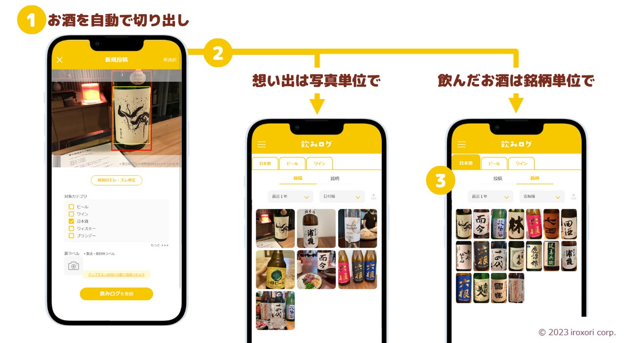 1,投稿画像から、AIがお酒のボトル、ラベルを自動で切り出します。