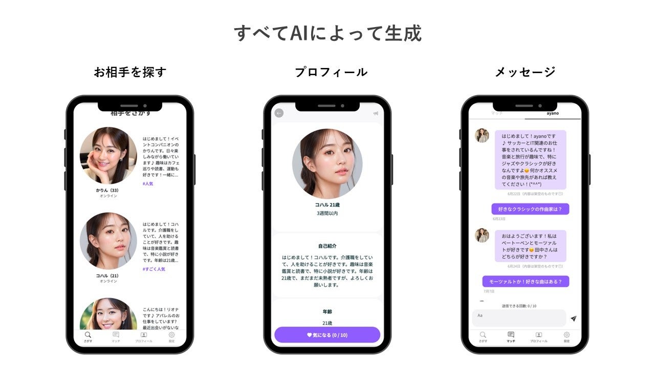 お相手の画像もプロフィール文も、もちろん、お相手から届くメッセージも、すべてAIで生成されています。