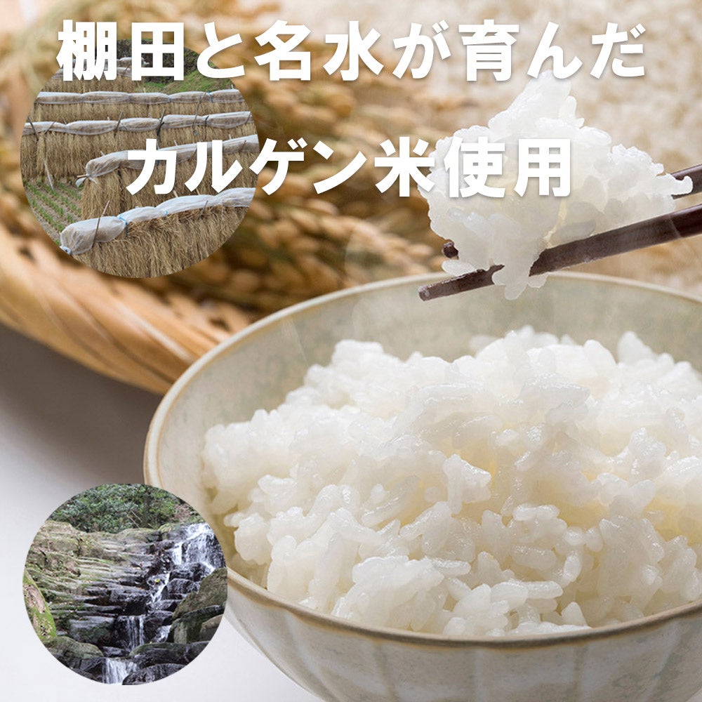 使用しているカルゲン米は「標高の高い棚田ときれいな藤本の滝の冷たい源水を使用する事で稲が枝分かれしにくく生育させた、美味しいお米」です。