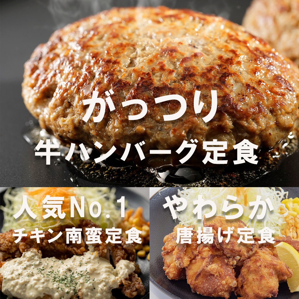 お店でも大人気の①ハンバーグ、②チキン南蛮、③唐揚げの3種の定食がセットになって、お店の味そのまま急速冷凍でお届け!