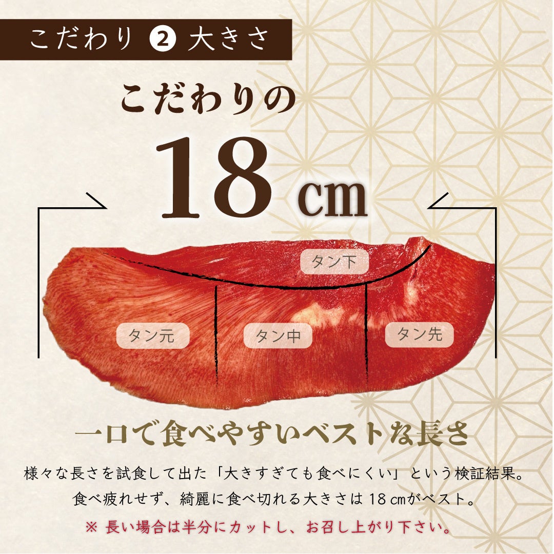 長さにもこだわり、牛タンは長すぎても食べづらく疲れてしまいます。さまざまな長さを研究した結果、様々な食感を楽しみつつ、質の良い脂と旨味を感じるのに最適な長さは18cmでした。