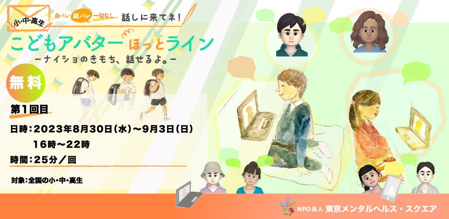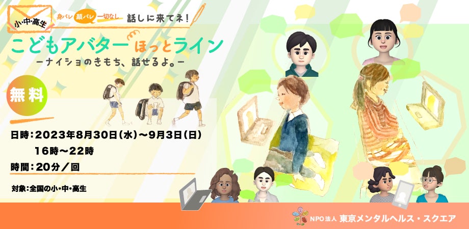 オンライン会議ツールZoomのアバター機能を活用して実施する1回20分の無料悩み相談。8月30日(火)~9月3日(日)16時~22時の期間中に実施。アバター機能を活用することによって相談者もカウンセラーも「顔出し、名前出し」が不要となり、苦しい思いを抱えているこども達がより相談しやすい環境を提供することを意図している。