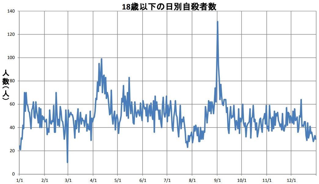 平成27年に厚生労働省から発表されたデータによると、18歳以下の日別自殺者数が9月1日が突出している状況となっています。要因として、「学校の長期休業の休み明けの直後は、児童生徒にとって生活環境等が大きくかわる契機になりやすく、大きなプレッシャーや精神的動揺が生じやすいと考えられる」と言われており、毎年同じ傾向となっているため、「9月1日問題」とまで呼ばれるようになりました。