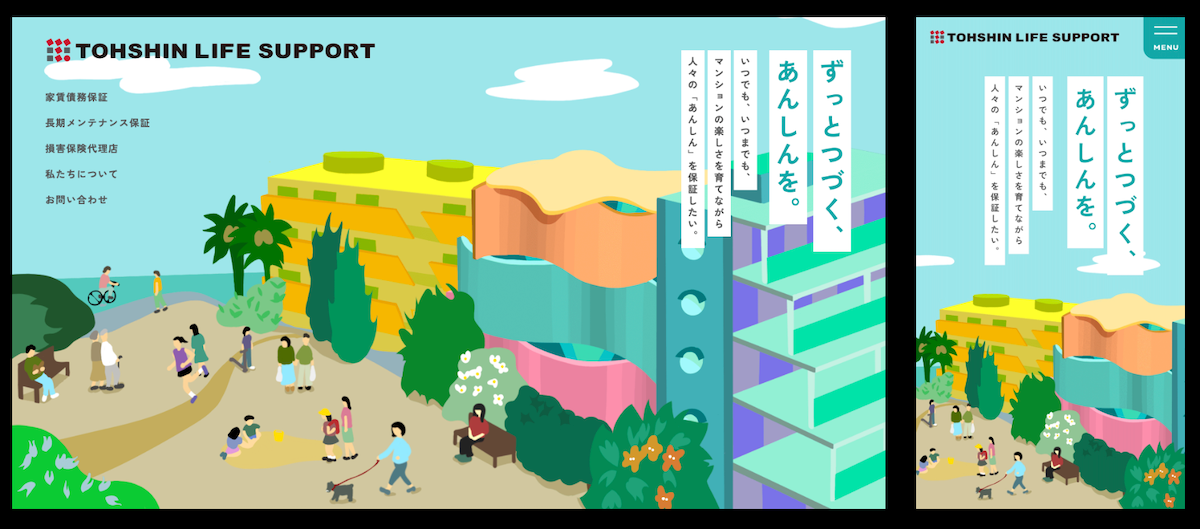 株式会社トーシンライフサポートは、新サービス『SUSTAIN』の提供開始に合わせ、コーポレートサイトをリニューアルしました。マンションに関わるすべての人々へ”安心に満ちた未来を提供したい”という想いから、「ずっとつづく、あんしんを。」というタグラインを設定。イラストを大胆に活用して楽しく安心に満ちた未来を表現するとともに、「家賃債務保証」「長期メンテナンス保証」「損害保険代理店」という事業の3つの柱を理解していただけるよう、ユーザビリティにこだわりました。