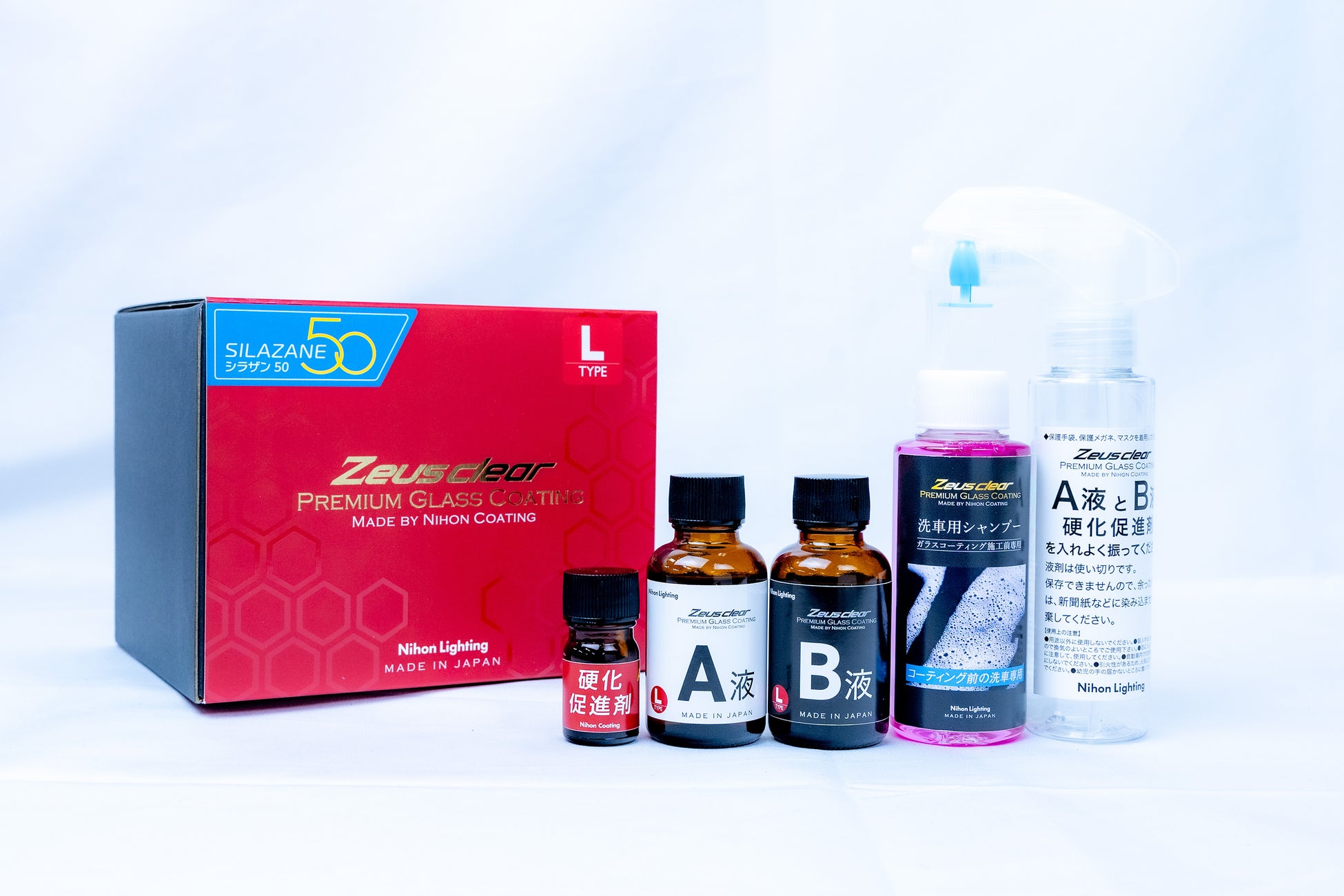 「ゼウスクリア シラザン50」は昨年8月末の発売以来、これまでのガラスコーティング剤の概念を覆すスプレー施工によって大きな話題となっています。従来ガラスコーティングはスポンジに少量添加して車体に塗布した後クロスで拭き上げるという方法が一般的で、作業に欠かかる時間と労力の負担が大きい商品でした。「シラザン50」は〈誰でも簡単に〉をテーマに開発され、スプレー化を実現したことで作業性が大幅に改善されました。これまで2時間程度要していたコーティング作業が1/4の約30分で完了します(中型セダンクラス)。
