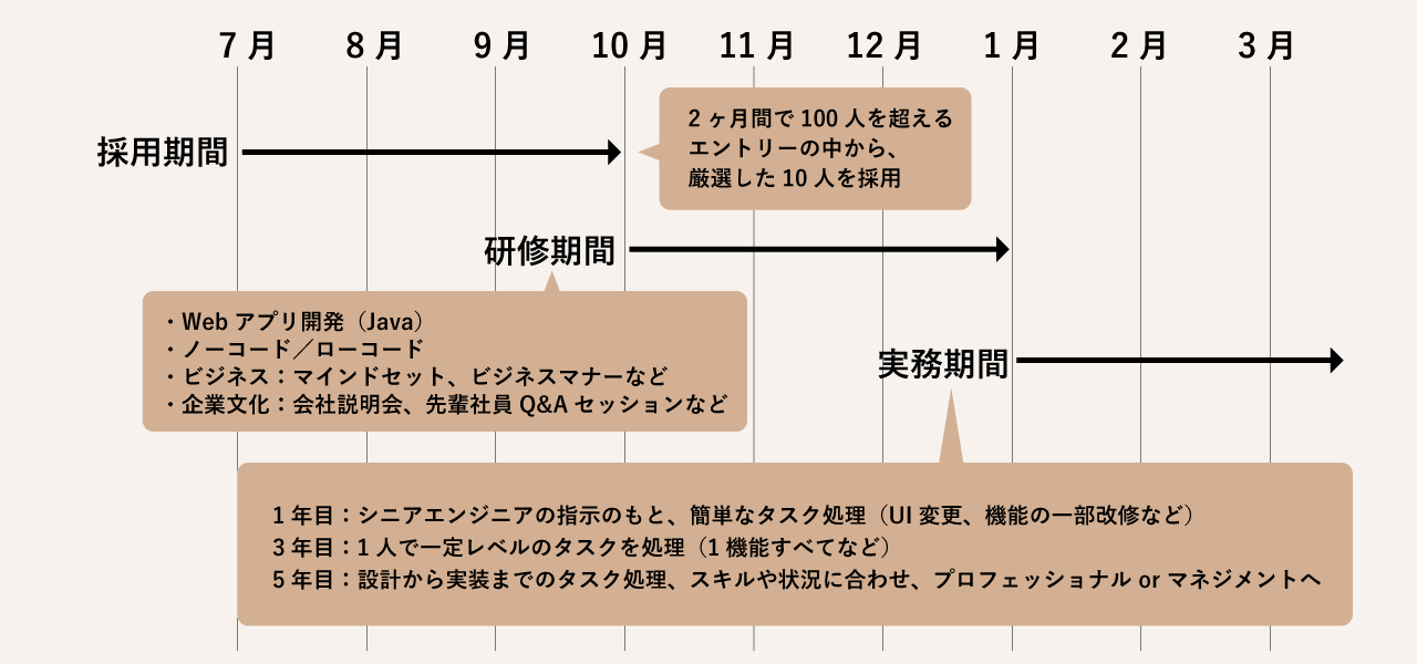 <採用〜研修〜実務の流れ>