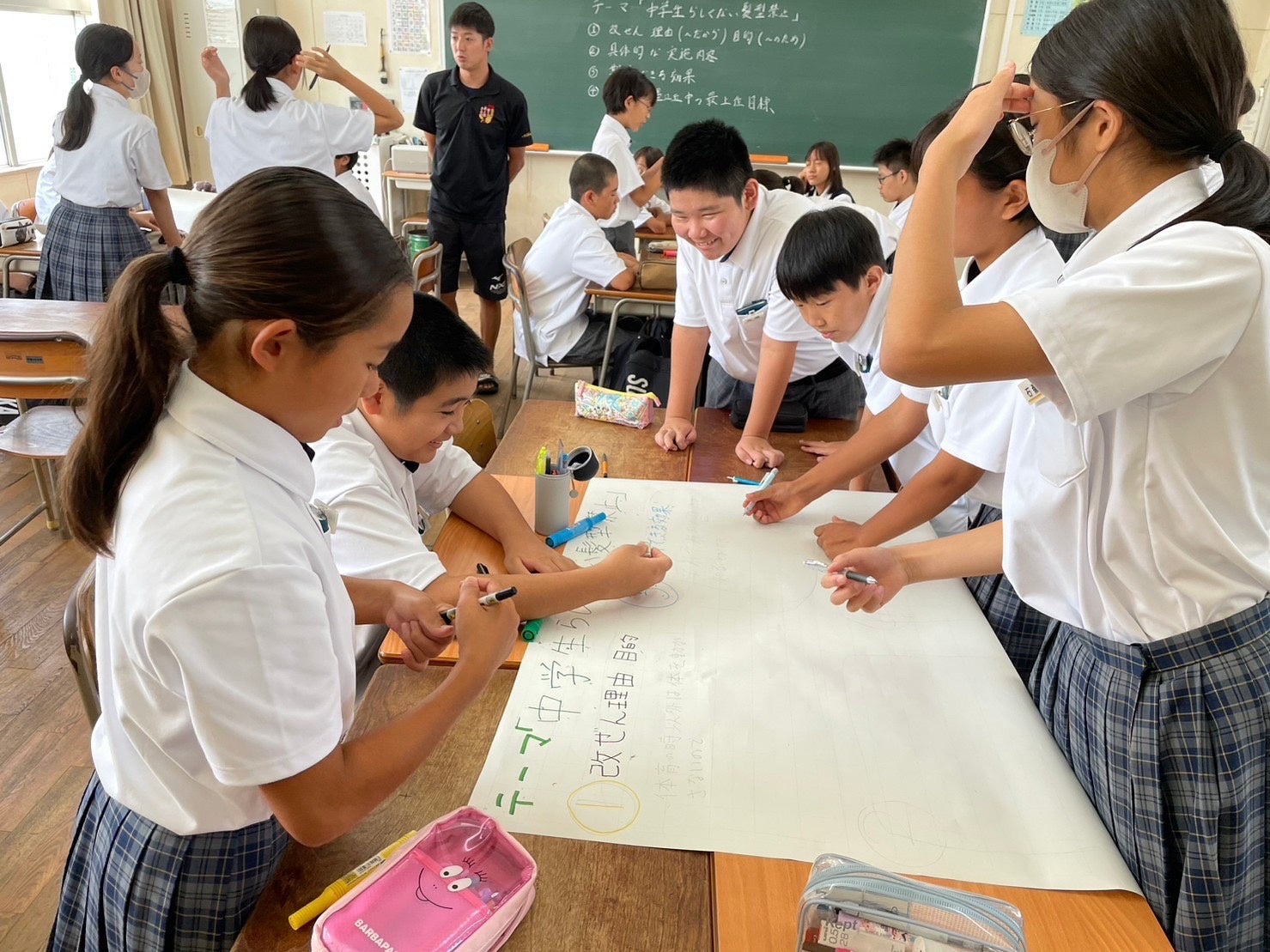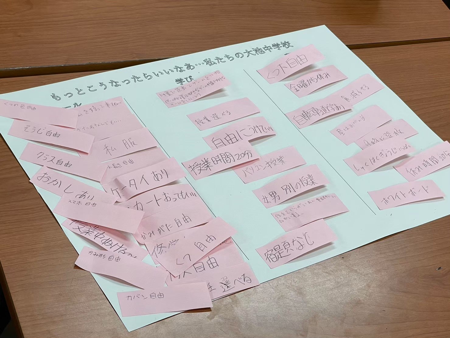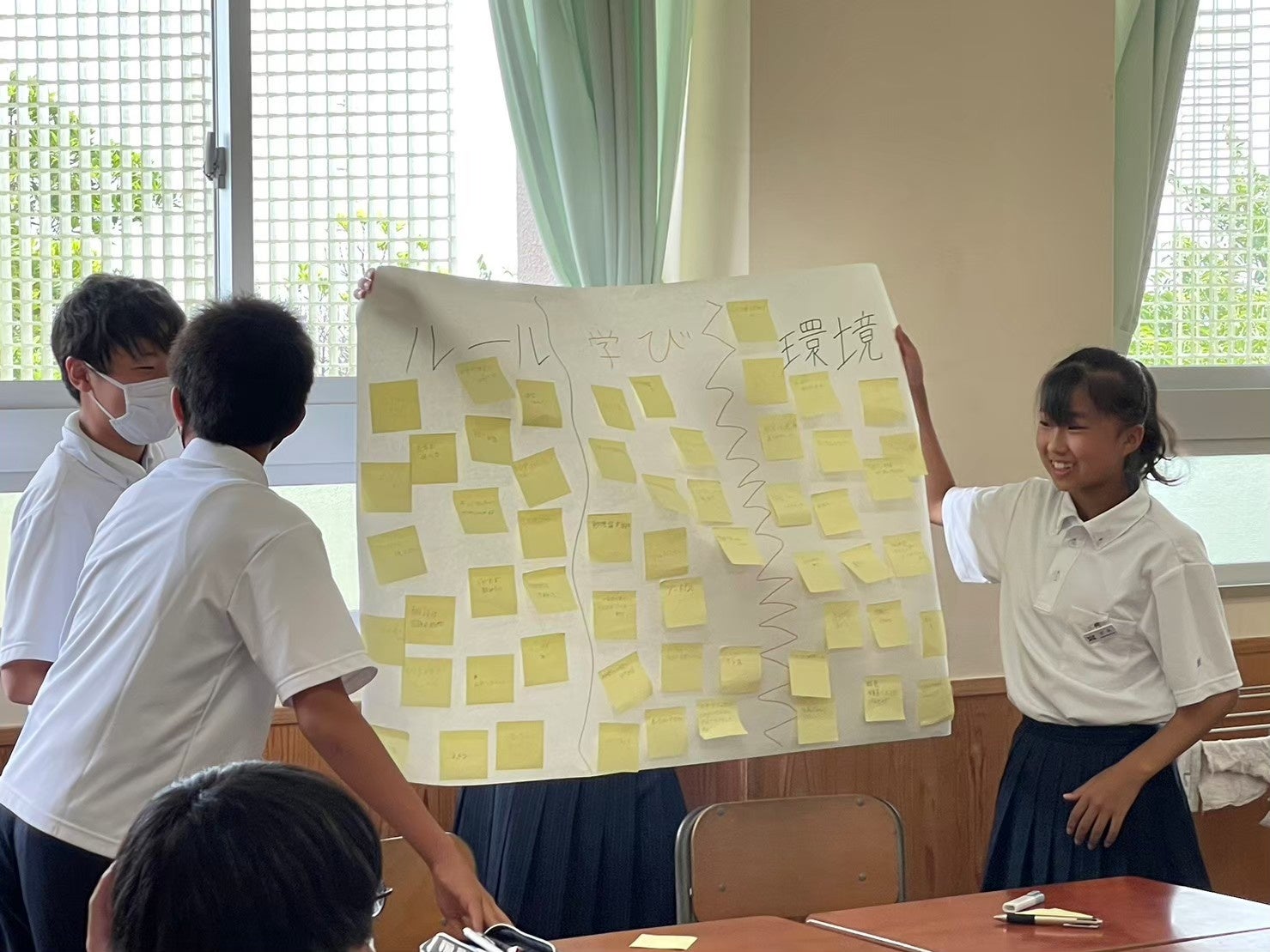 最上位目標達成に向けて、その実現を妨げている不要な校則やルールを生徒同士で話し合いを通じて見つけていただき、そしてその校則やルールを改善するために必要なことは何かを生徒自らが考え発表していただきました。