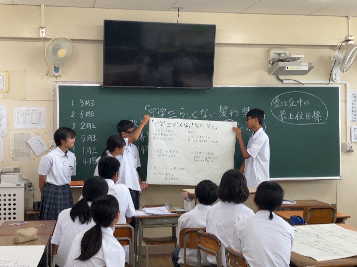 工藤先生に生徒へ向けて「対話をして合意をするとはどういうことなのか」という内容でzoomでの講師講演をいただきました。またその後生徒同士で「どういう学校にしたいのか」をテーマに話し合いを行っていただき、多数決ではなく話し合いで一つの最上位目標を設定しました。