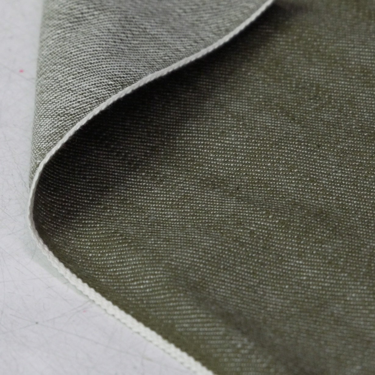 生地は、経糸9番 緯糸12番のナチュラルムラ糸を旧式の力織機で織り上げたセルビッチデニムになります。打ち込みを甘めにしていることと、シャットル織機を使用して織り上げている為、凹凸感のある粗野な雰囲気の生地になっています。染料は反応染料でミリタリーグリーンを表現しています。