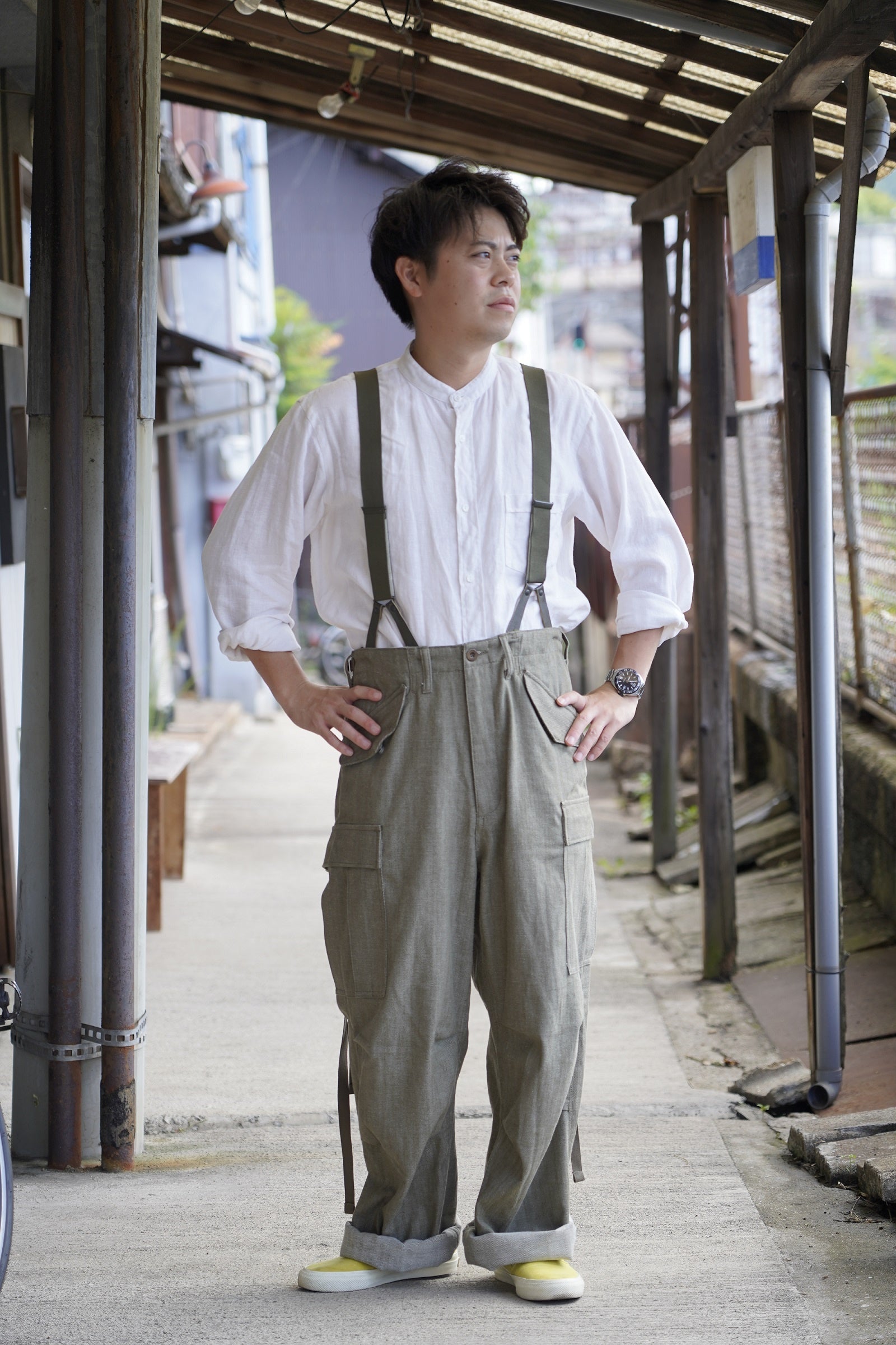 実際に触れてみると非常に肌ざわりが良くて、身に着けてみたい衝動に駆られると思います。このような素材に出会ったことで、カーゴパンツを得意としている工場としてワクワクしました。これまでのプロジェクトの第二弾では、ミリタリーアイテムの中でも人気が高く、多くのデザイナーやブランドがモチーフにもする名品とも言える「M-47」というモデルを採用しました。今回は、同じく名品とされている「M-51」をモチーフにしています。サイズ感は、サスペンダー使用もできるようにオーバーサイズにしています。