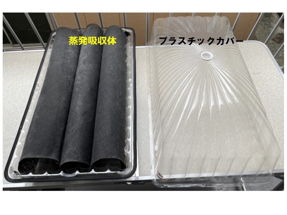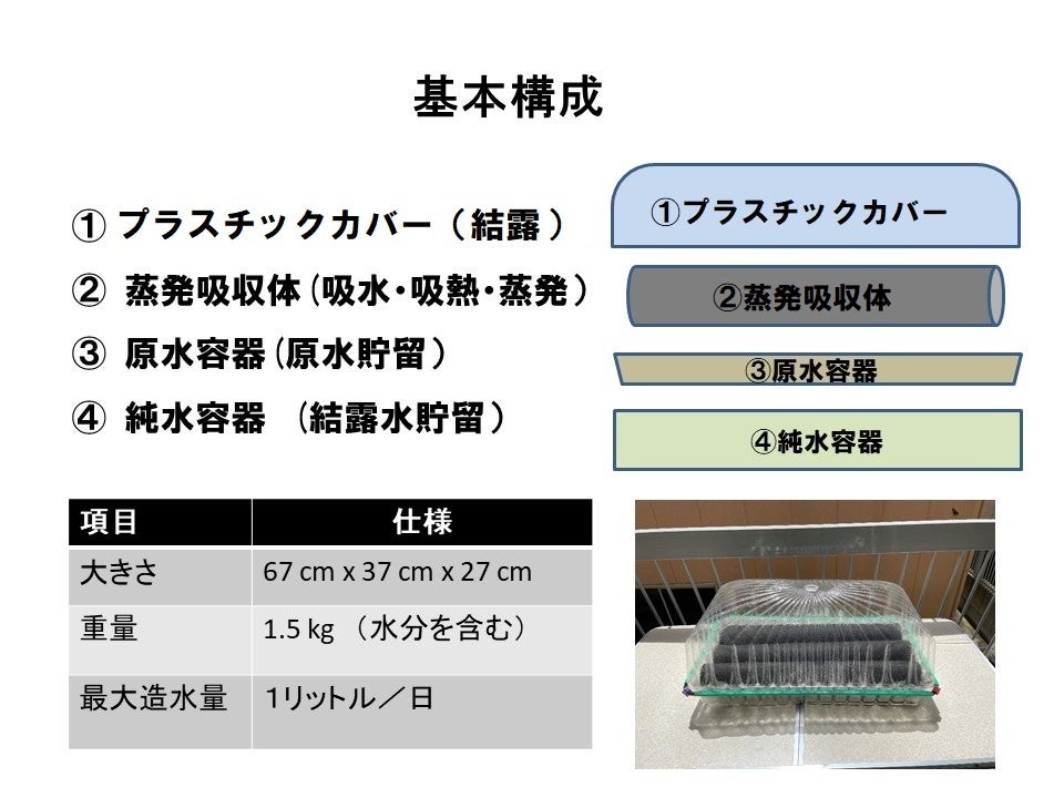 既製品のプラスチックカバーを流用することで製造コストを大幅に削減。内部の蒸発吸収体は太陽熱を効率よく吸収し、水分蒸発を促進します。また、多くの部品はホームセンターで入手可能で、独自の金型製作の必要がないため、コストを大幅に抑えることができました。