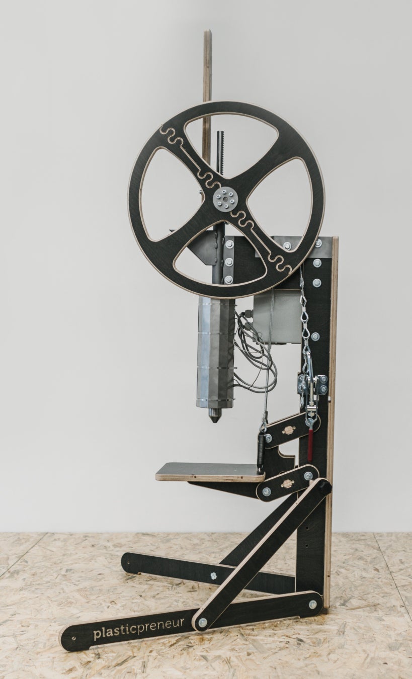 洗浄したPETボトルキャップを粉砕し、約200℃の熱で溶かして型に流し入れて固め、その場で簡単にアップサイクル製品をつくることができるのが「マニュアル式インジェクション装置」。