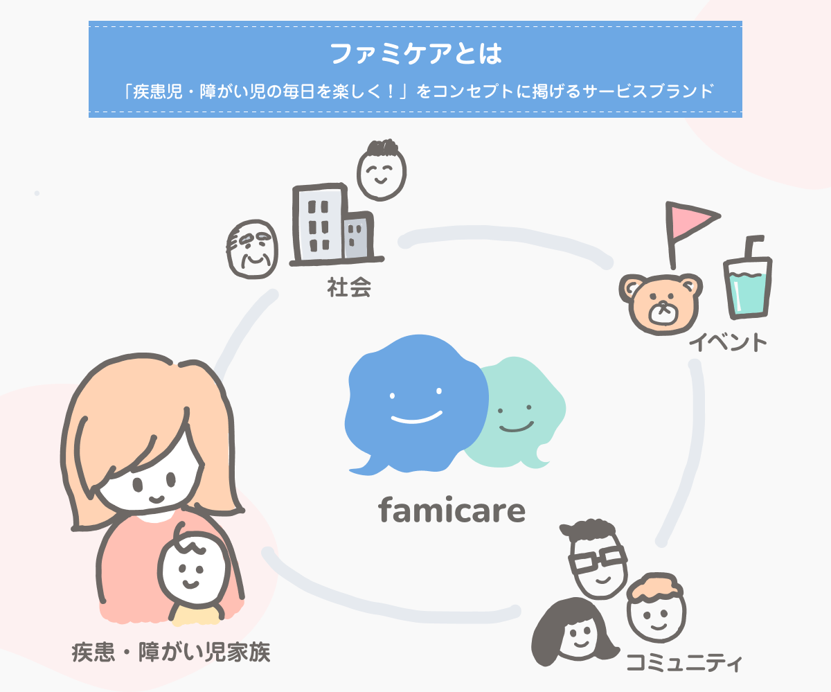 ファミケアは「疾患児・障がい児の毎日を楽しく!」をコンセプトに掲げるサービスブランドです。疾患や障がいのある子どもとその家族が困っている事を解決し、楽しい!と感じる時間を一瞬でも多く生み出す事を目指して誕生しました。