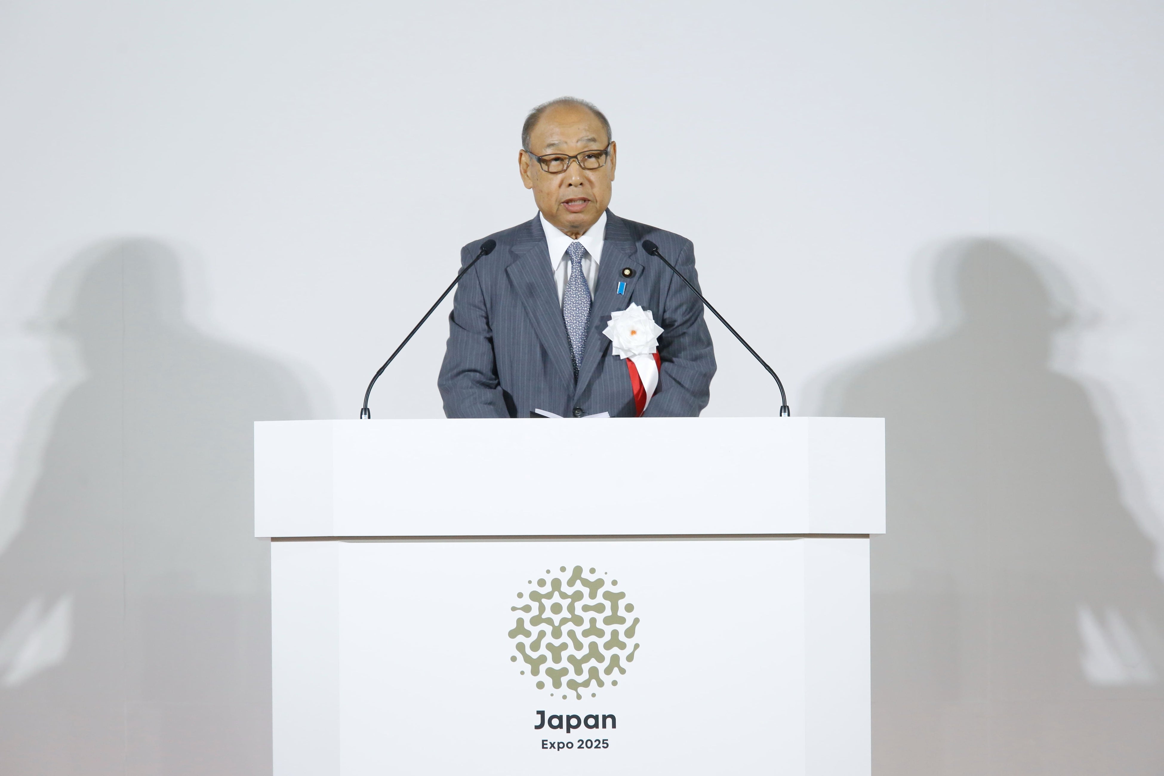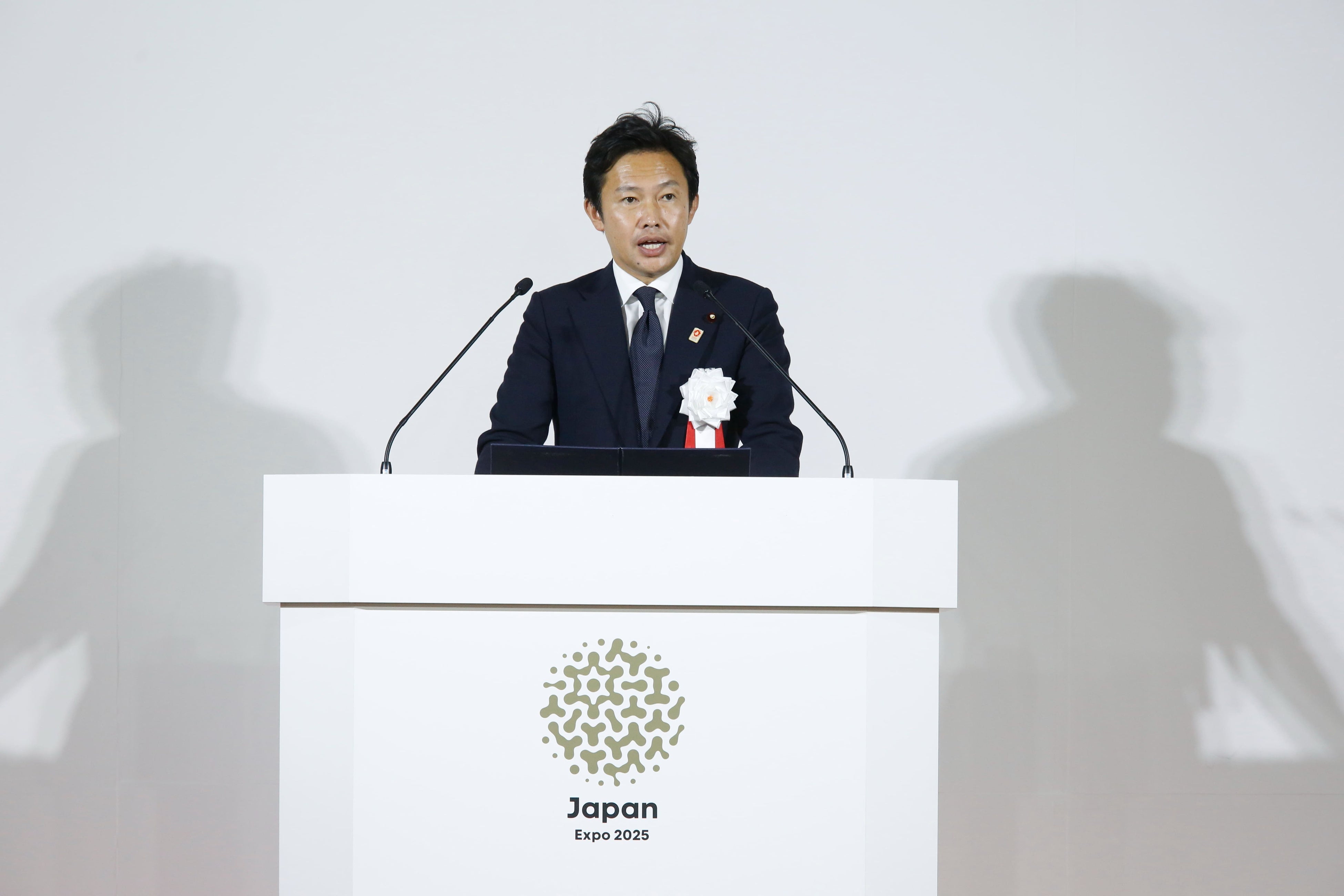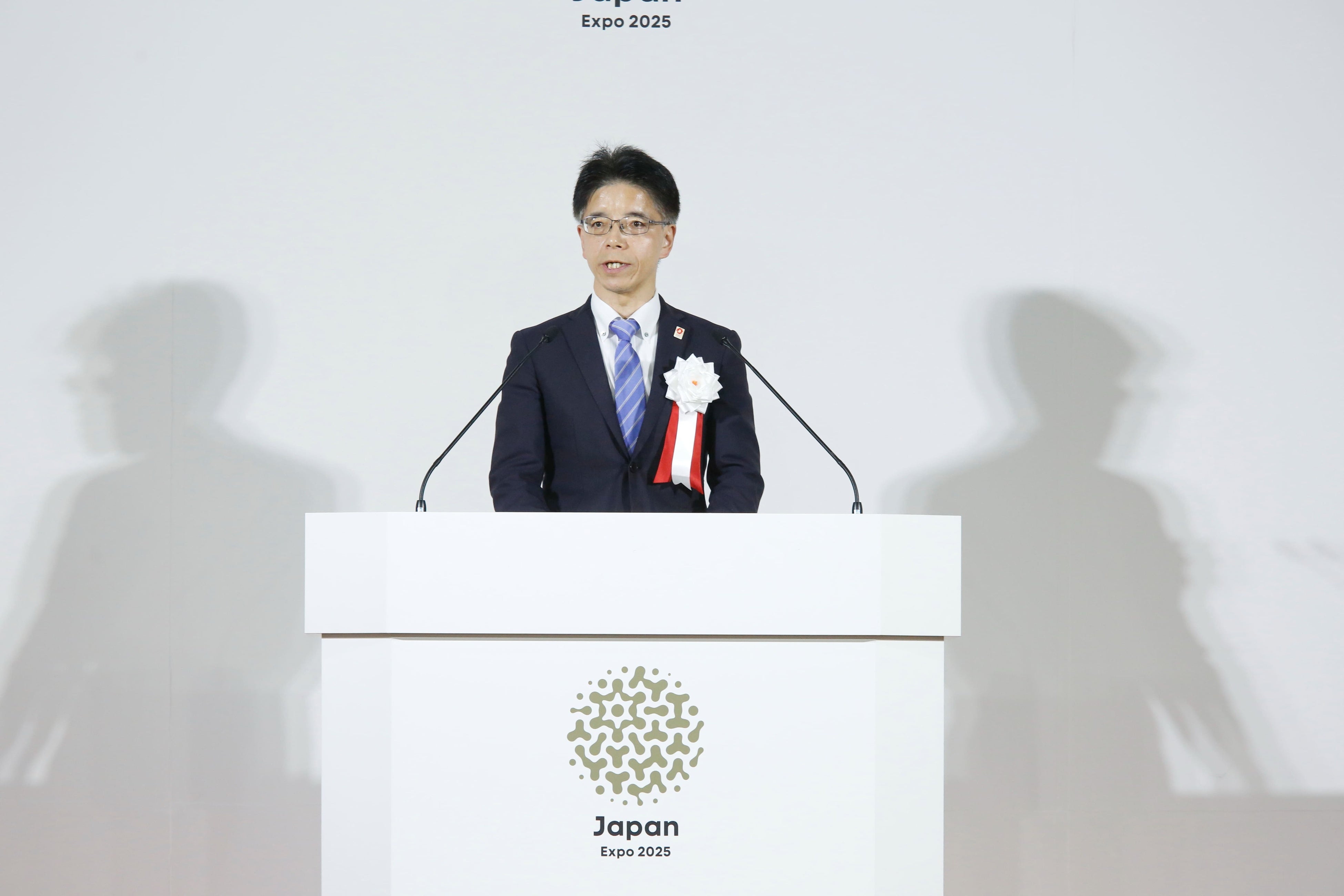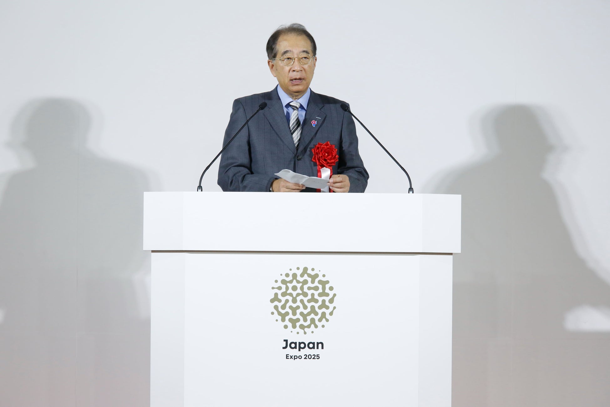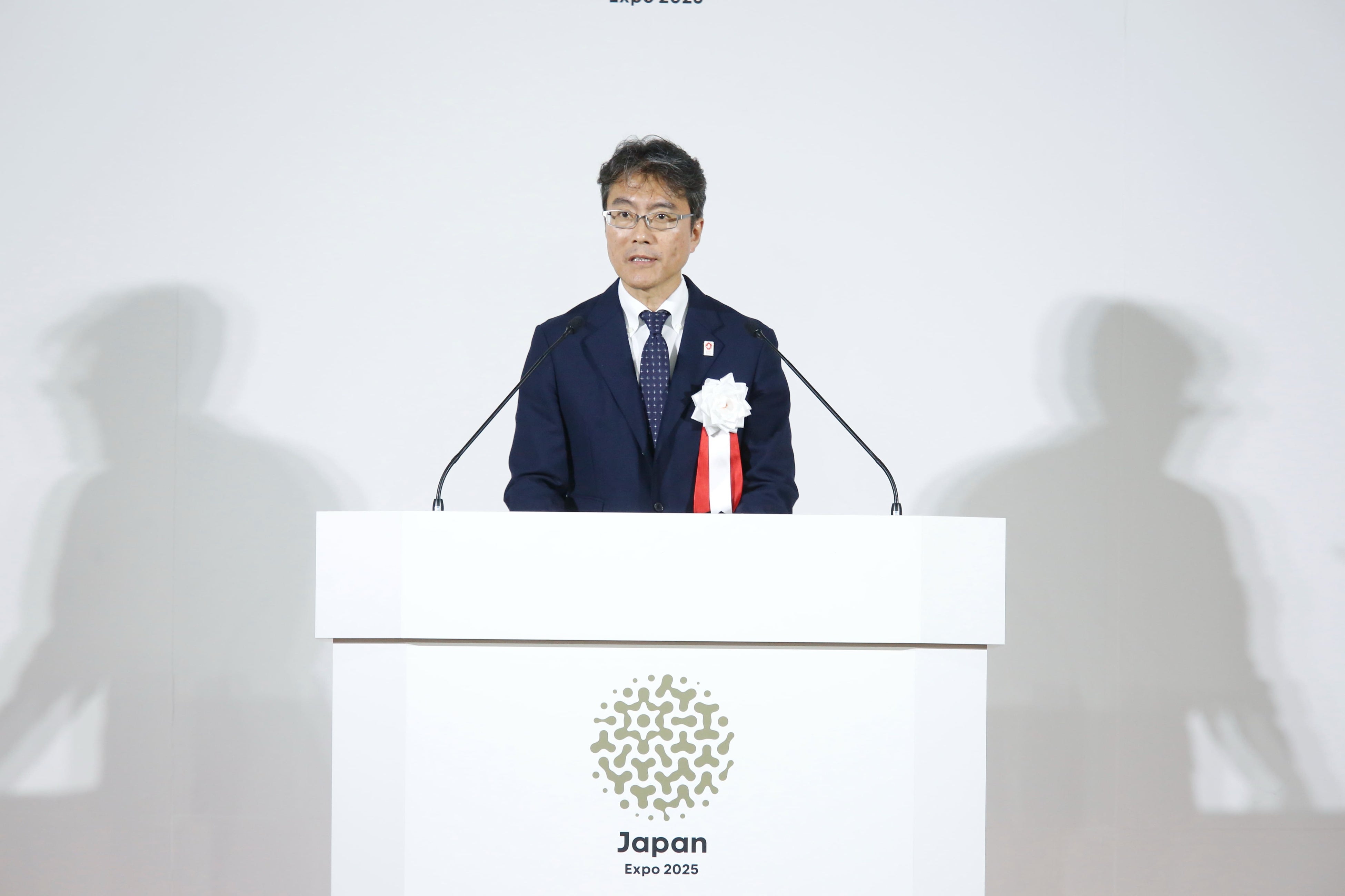 開会の辞として、「日本政府館は万博の顔であり、“いのち輝く未来社会のデザイン”をテーマに、工事の安全と日本館に来場いただく皆様に日本の魅力をお届けする場所になることを祈願して、ここに開会を宣言いたします」と開会を宣言しました。