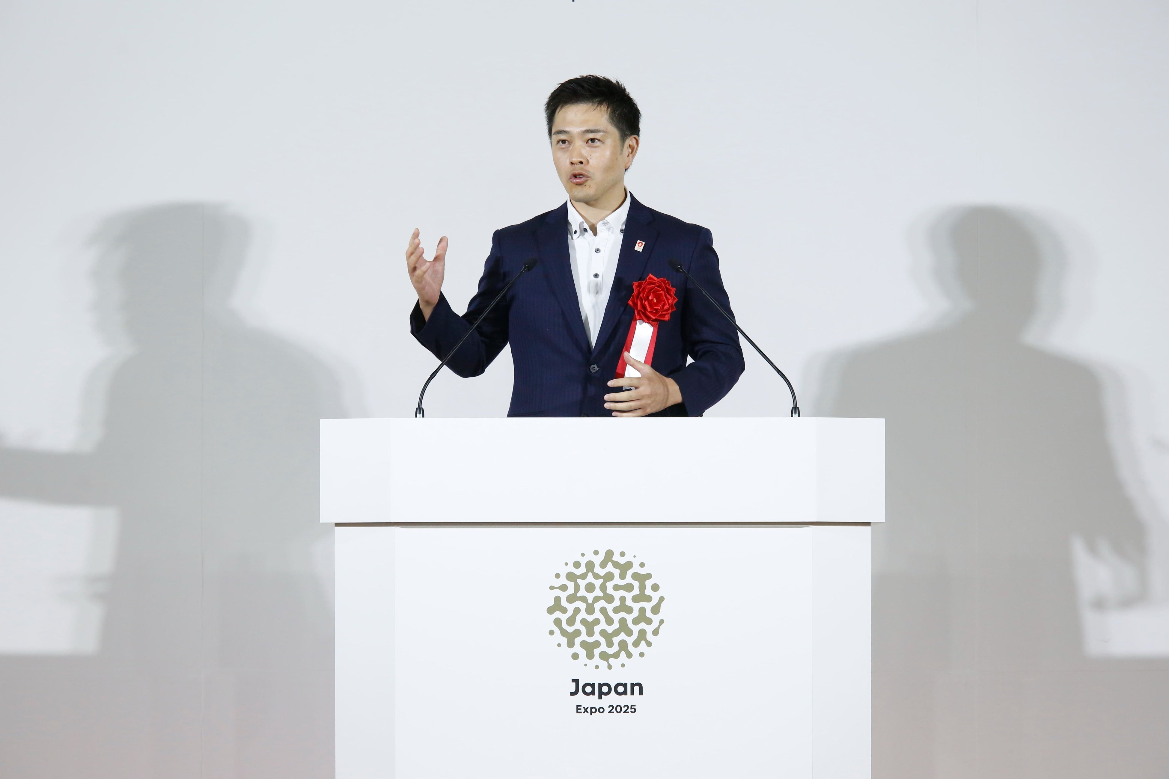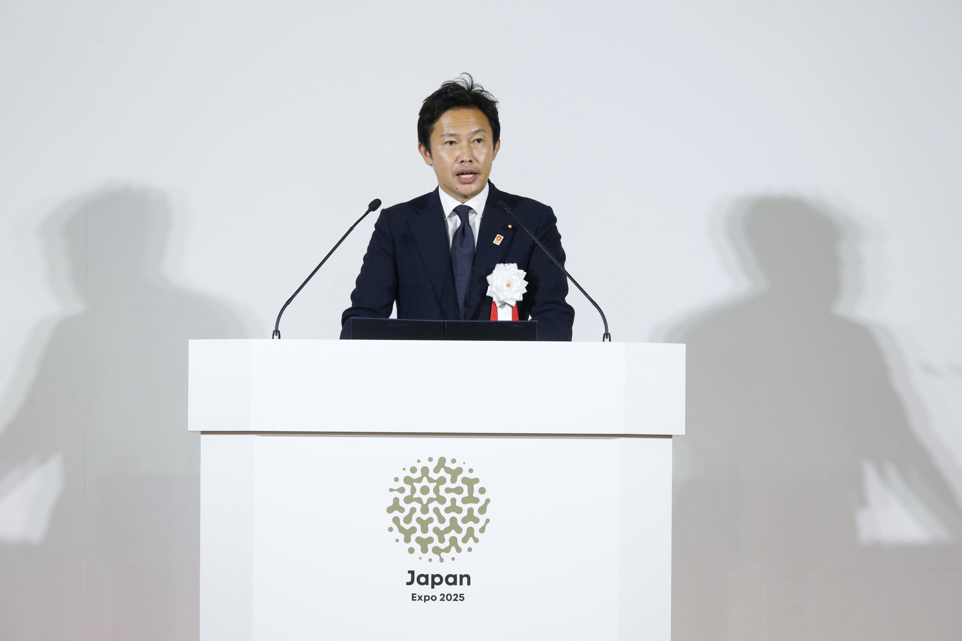 開催地自治体代表挨拶では、「会場全体では幅30メートル、一周2kmの世界最大級の木造建築として、 大屋根リングの建築が進んでいます。日本館のテーマは“いのちと、いのちの、あいだに”ということだが、まさに“いのち輝く未来社会のデザイン”という万博テーマのど真ん中であり、世界に対して日本の技術、目指す方向性、未来社会を発信していかれることを私自身楽しみにしている」と日本館への想いを述べ、「2年後には“未来社会”がここで実現し、素晴らしいパビリオンになることを願いたいと思います」と締め括りました。