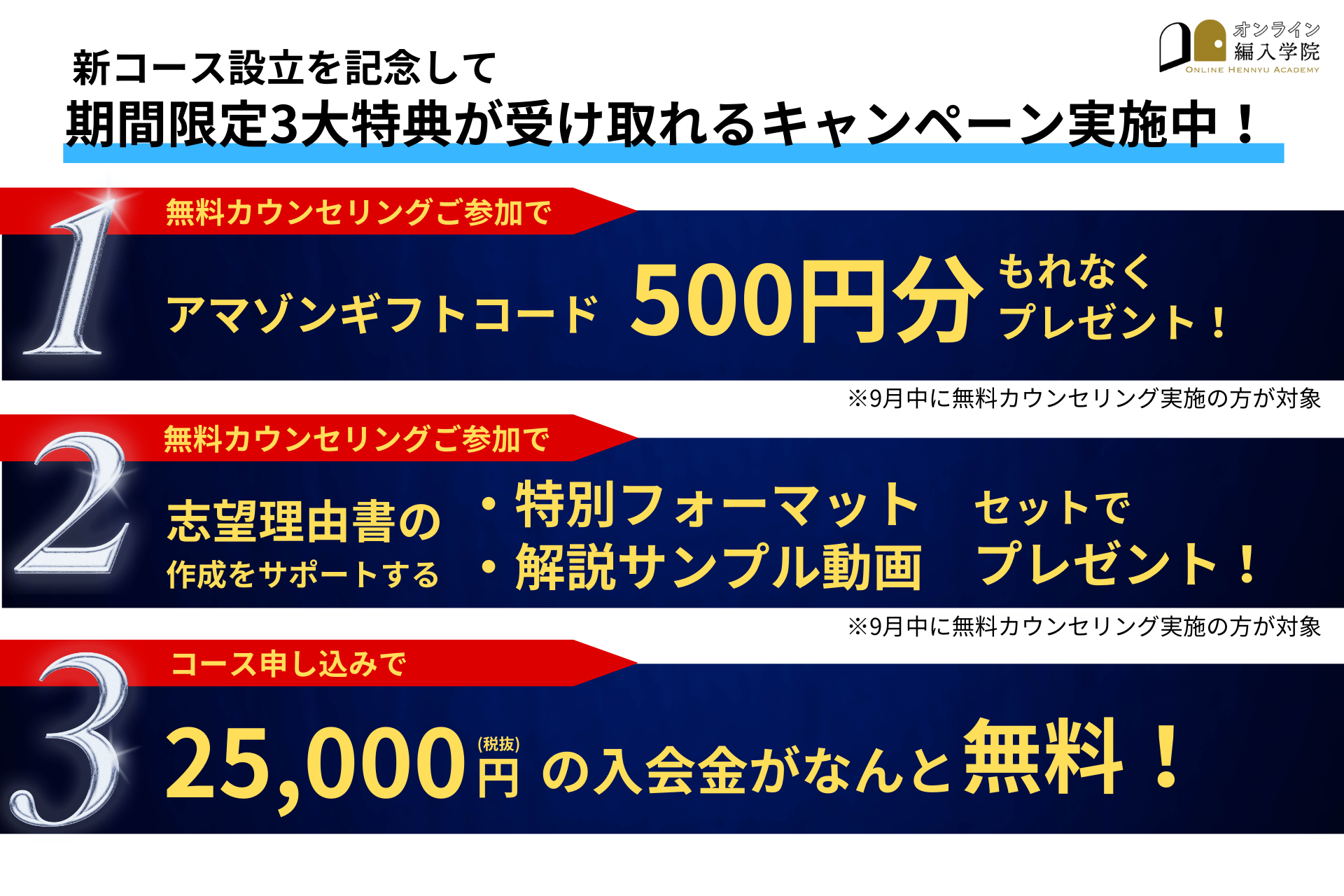 特典1,2はカウンセリング実施後に受取り可能。編入試験に関する更なる詳細把握や些細な疑問も解決するチャンスとなっておりますので、興味を持たれた方は、ぜひ無料カウンセリングをお申込みください!