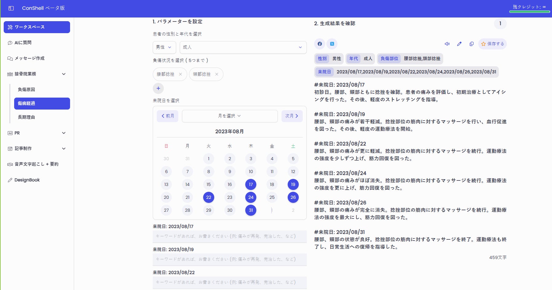 『Conshell』を使えば患者の特徴や負傷状況、来院日などを選ぶだけでカルテ用の文章案を生成し、記載業務をサポートすることも可能です。