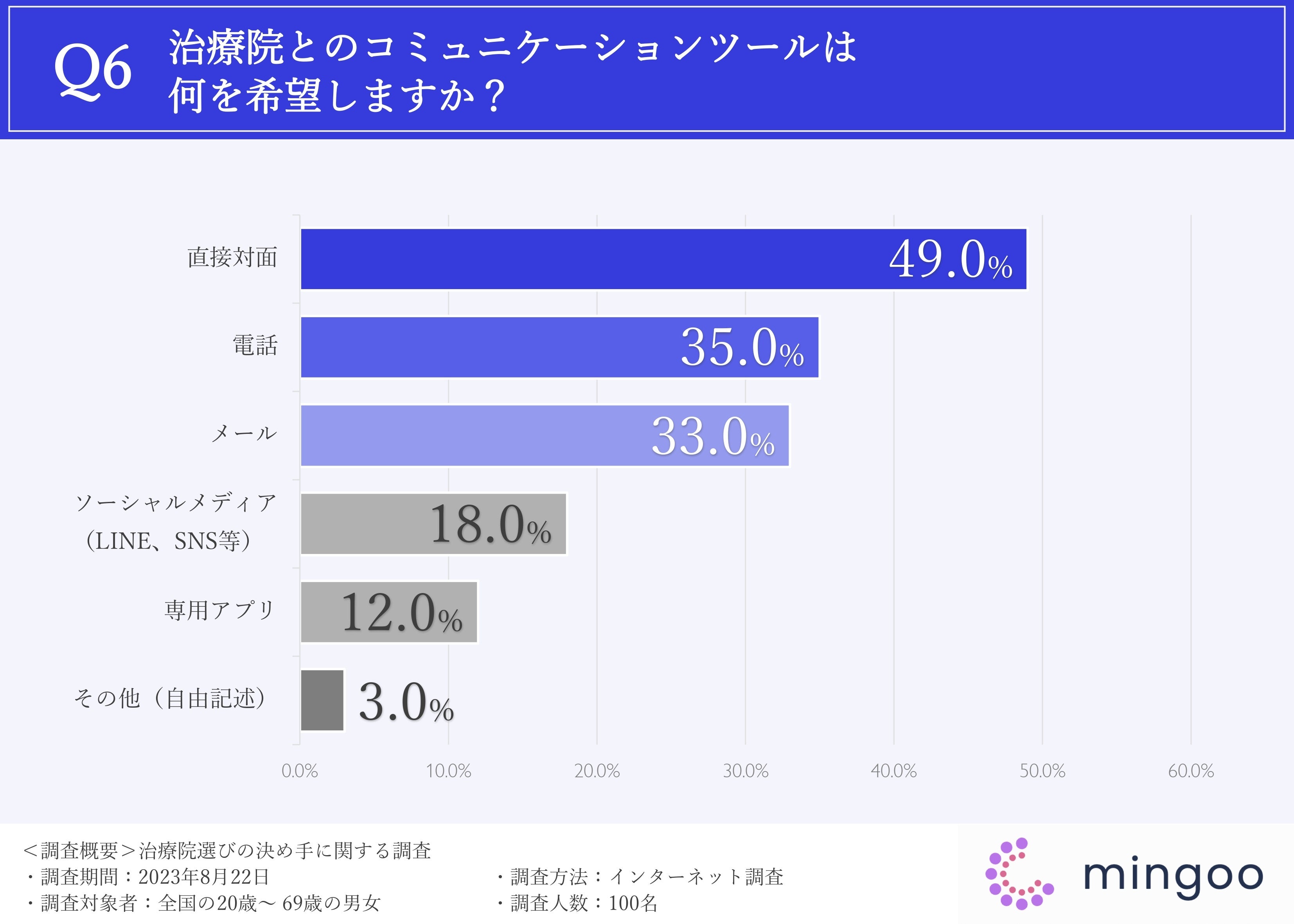最後に、希望する治療院とのコミュニケーションツールを伺ったところ、「直接対面」と回答した方が49%で最も多く、「電話」が35%、「メール」が33%という結果となりました。