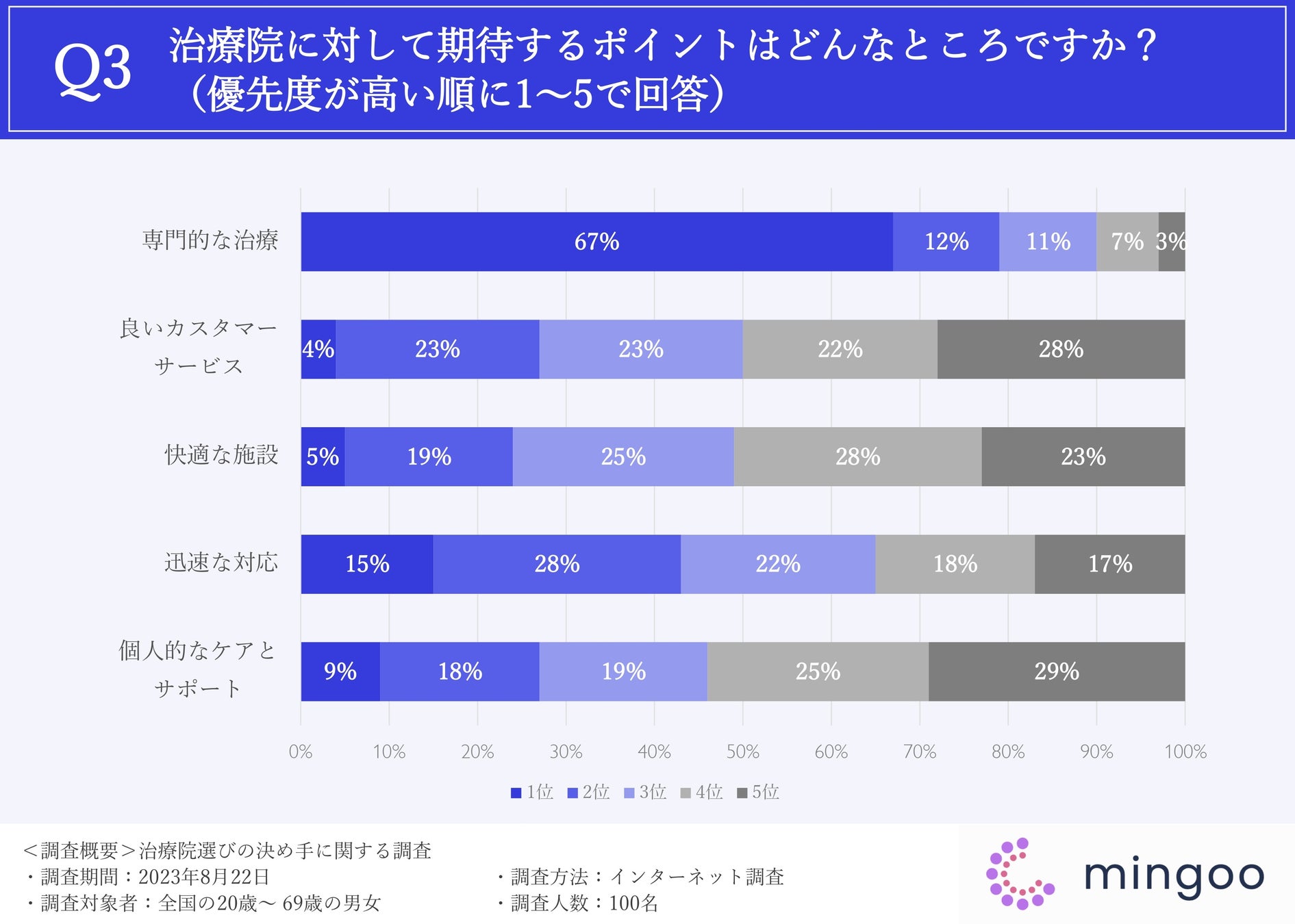 続いて、治療院に期待するポイントについて伺ったところ、67%の方が「専門的な治療」を最も優先度が高いポイントとして求めていることがわかりました。
