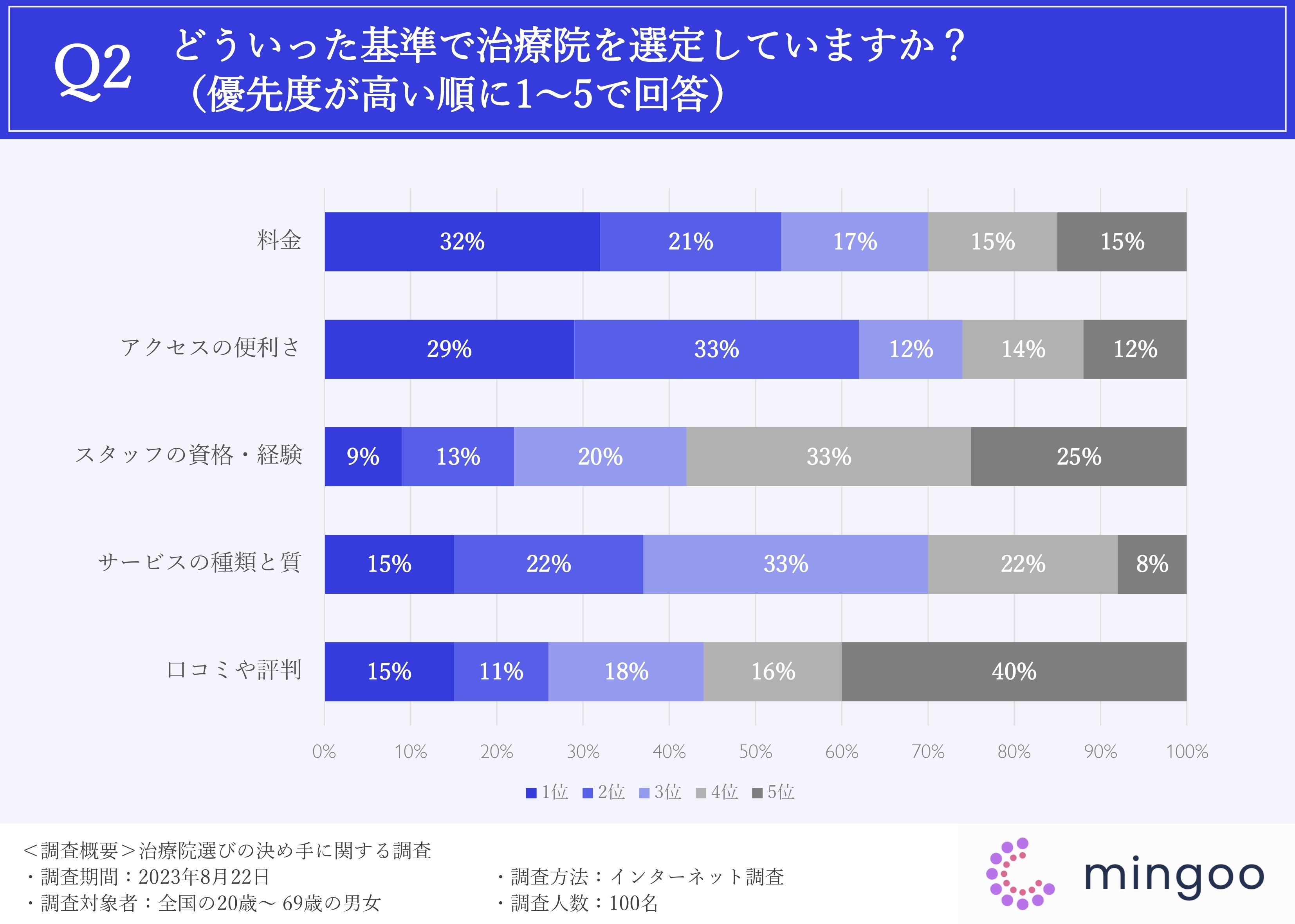 最も優先度が高い基準として32%の方が「料金」、29%の方が「アクセスの便利さ」の順で重視されていることがわかりました。
