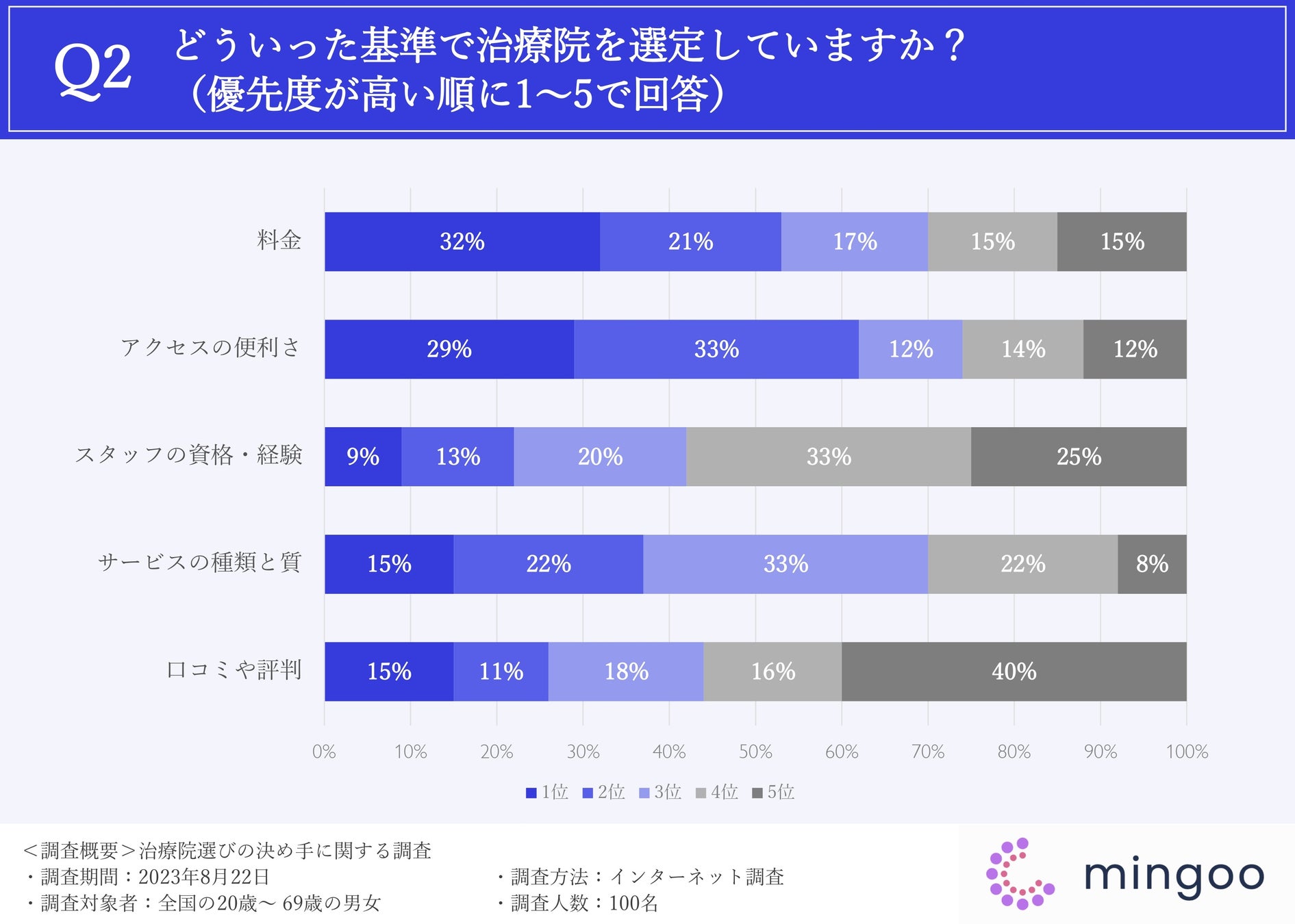 また、24%の方が回答した「アフターケアのサポート」も次いで回答数を集めていることから、サービスの質だけでなく、接するスタッフや治療院との密なコミュニケーションは、お客様が求めるポイントに挙げられるのではないでしょうか。