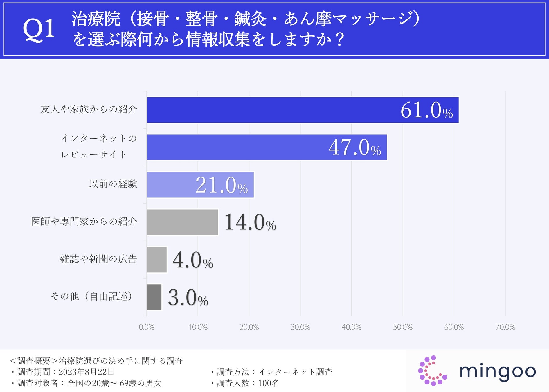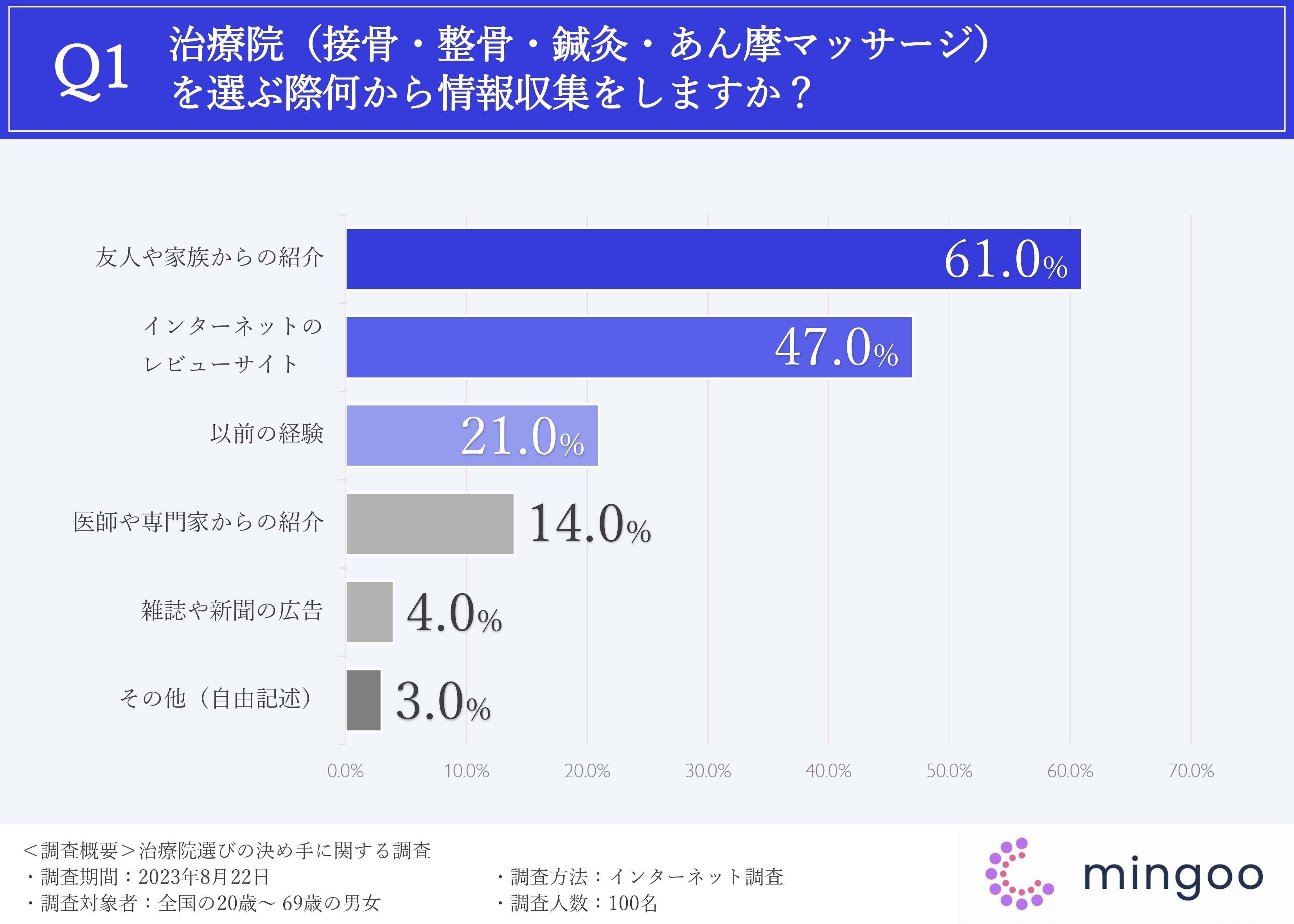 治療院(接骨・整骨・鍼灸・あん摩マッサージ)を選ぶ際の情報収集は、「友人や家族からの紹介」を参考にする方が61%で最も多いことがわかりました。