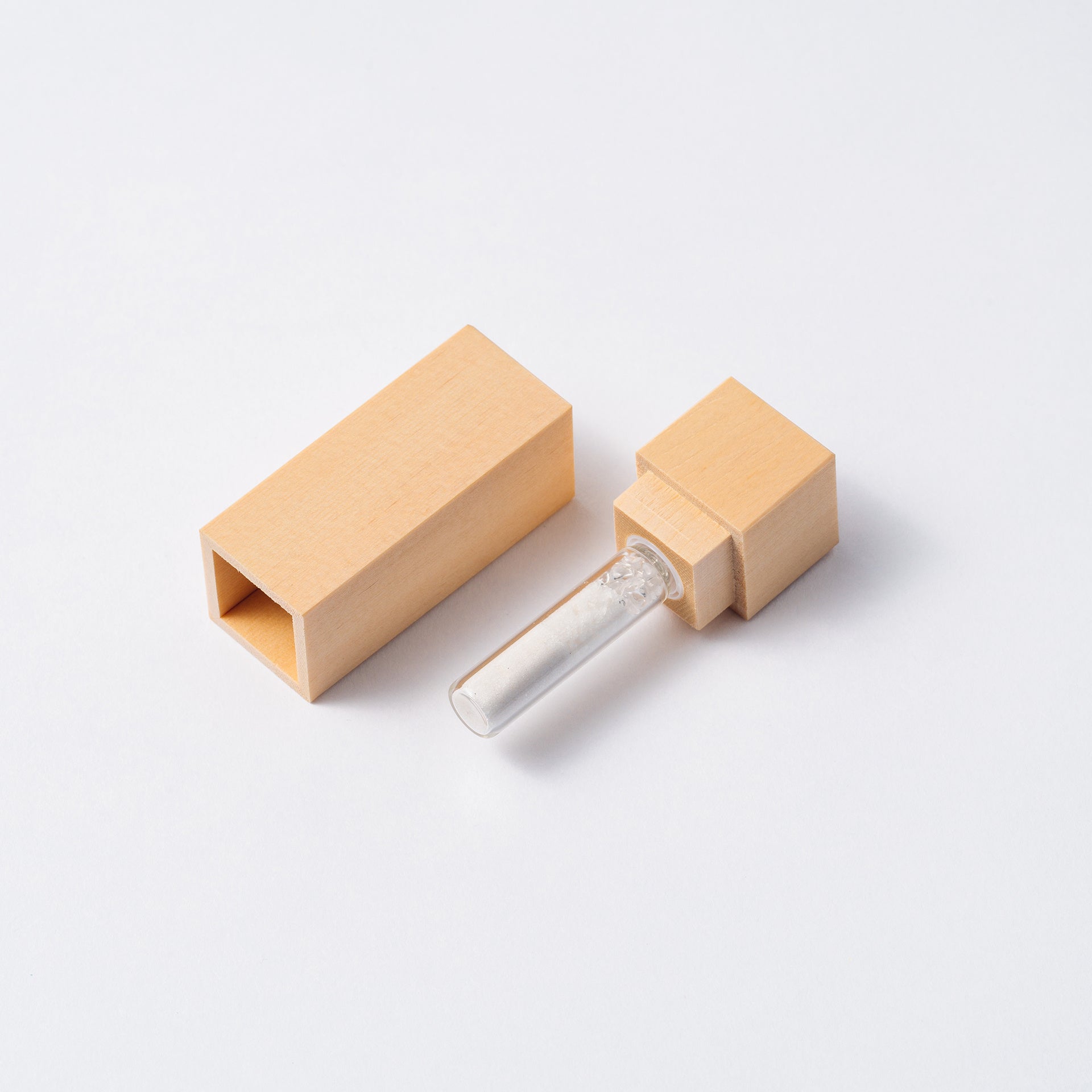 スピリチュアルなお守りとして、日常的に清められるクリスタルソルト。リップスティック型の木曽桧のケースのなかの、筒状のガラスに塩とクリスタルパウダー、水晶のチップを3層に。ポーチなどに入れて持ち歩ける形に仕上げました。麻袋付き。