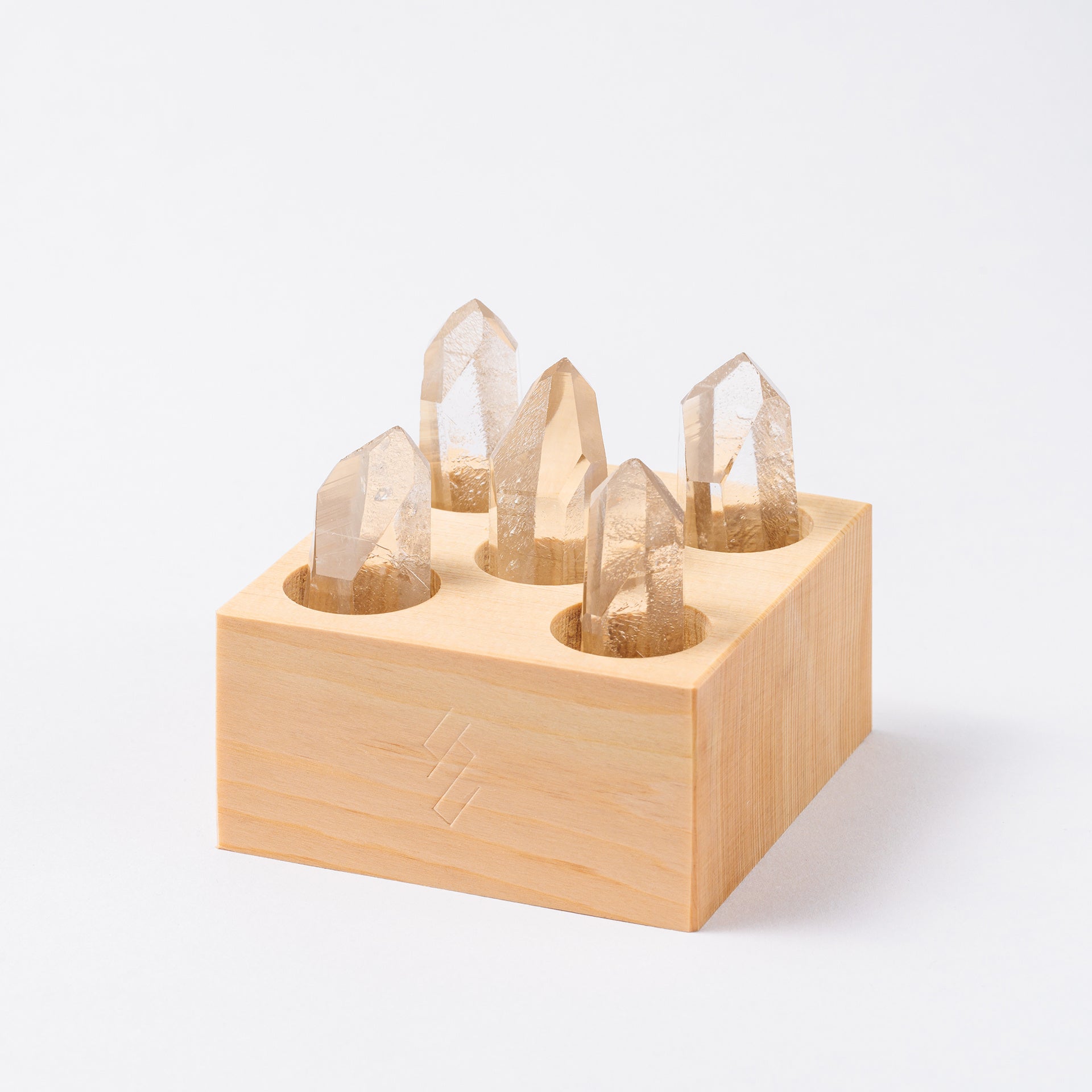 自然のままの美しさを持つラフクリスタルを5本セット。鋭角的な先端からもパワーを得られ、四方の結界をはることで邪気を遠ざける効果も。木曽桧の台にセットすれば、オーガニックな存在感を楽しめます。